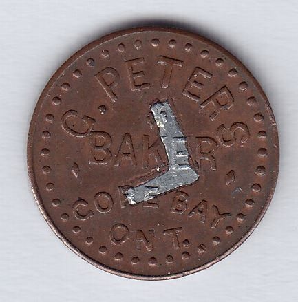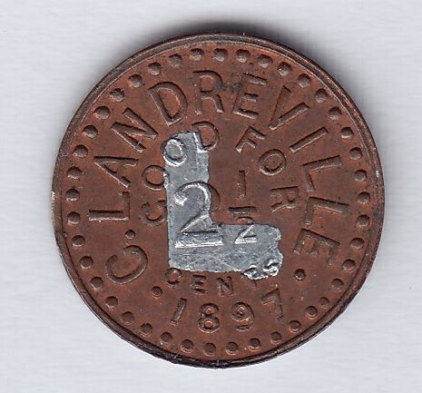 Ler 1070z C. Landreville 1897 2 1/2 cents muled with the obverse of Ler 1072h G. Peters Gore Bay. Struck in copper with an aluminum L in centre. EF.
