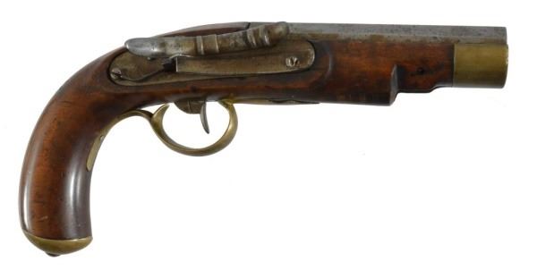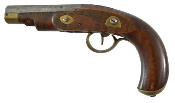 Circa 1845. Fair trigger, weak spring. 4-1/2" barrel pocket pistol. Octagon barrel. Tiger tail wood. Brass band at barrel mouth. Brass trigger guard butt cap.