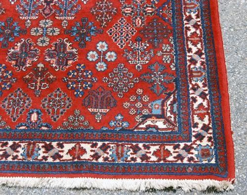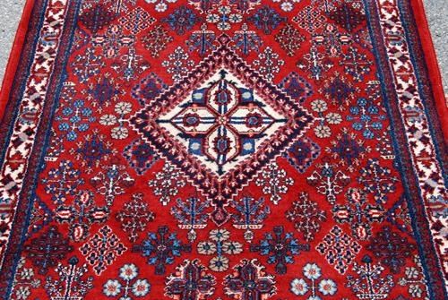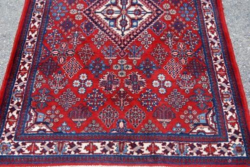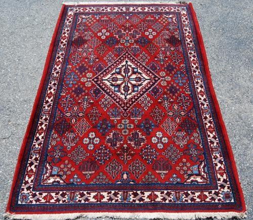 Mulitple motif design authentic Persian Maymah. Made of fine quality lamb's wool pile on cotton foundation, all natural vegetable dye, this beautiful Persian Maymah incorporates mulitple floral motifs on a rich red background and is finished off beautifully by an intricately done floral border. Hand woven in Maymah, Iran. Size 6 feet 4 inches X 4 feet.