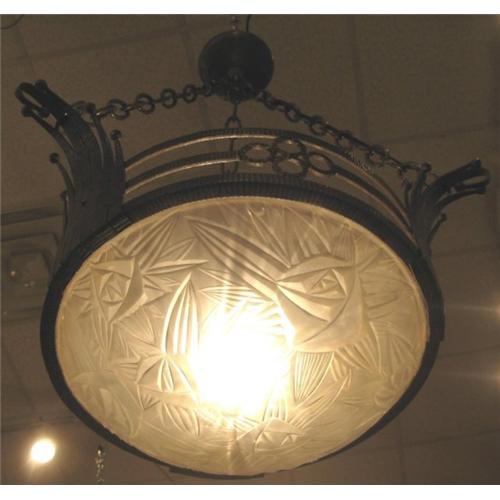 A Muller style hand-hammered, forged iron Art Deco light fixture.