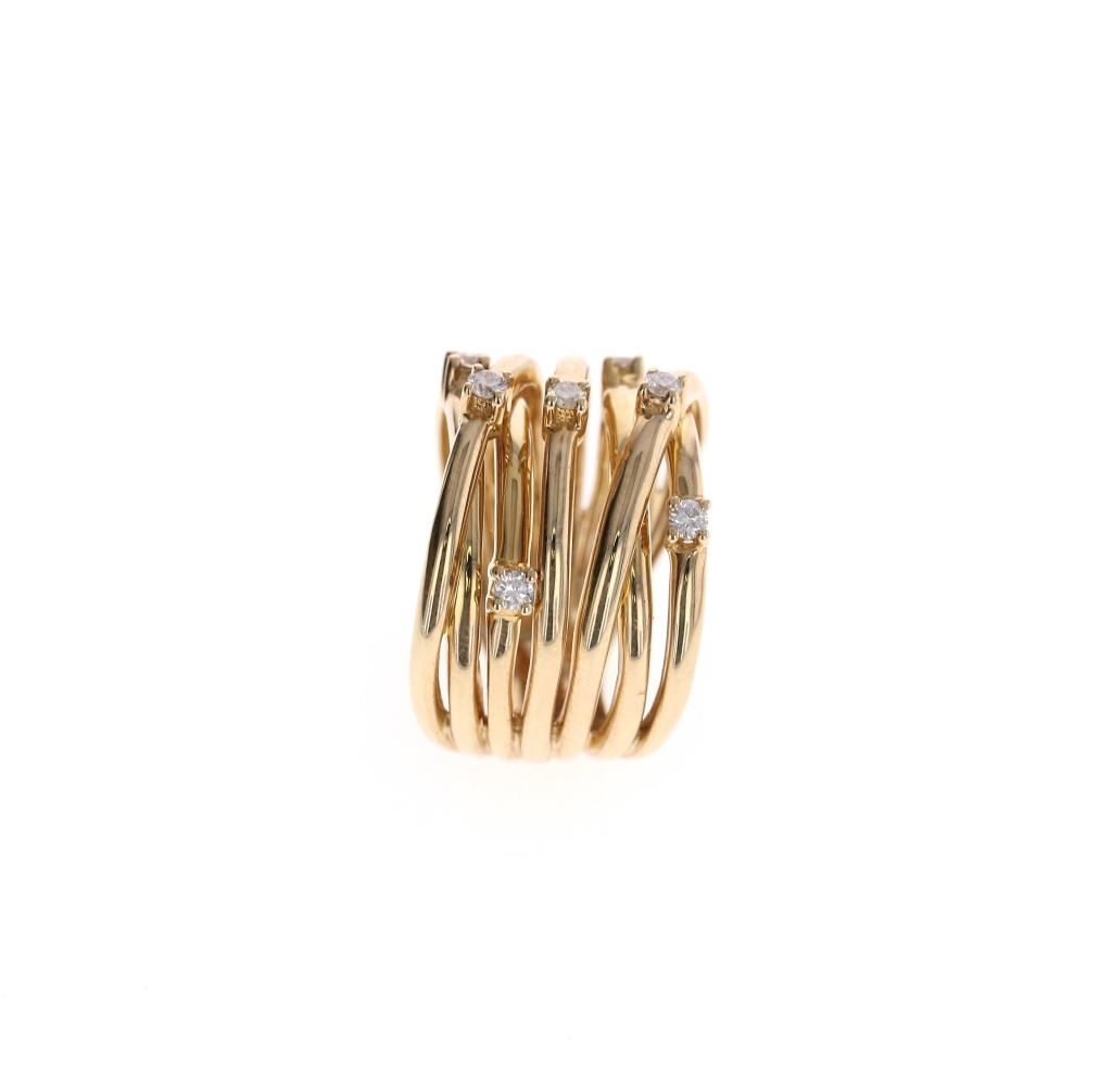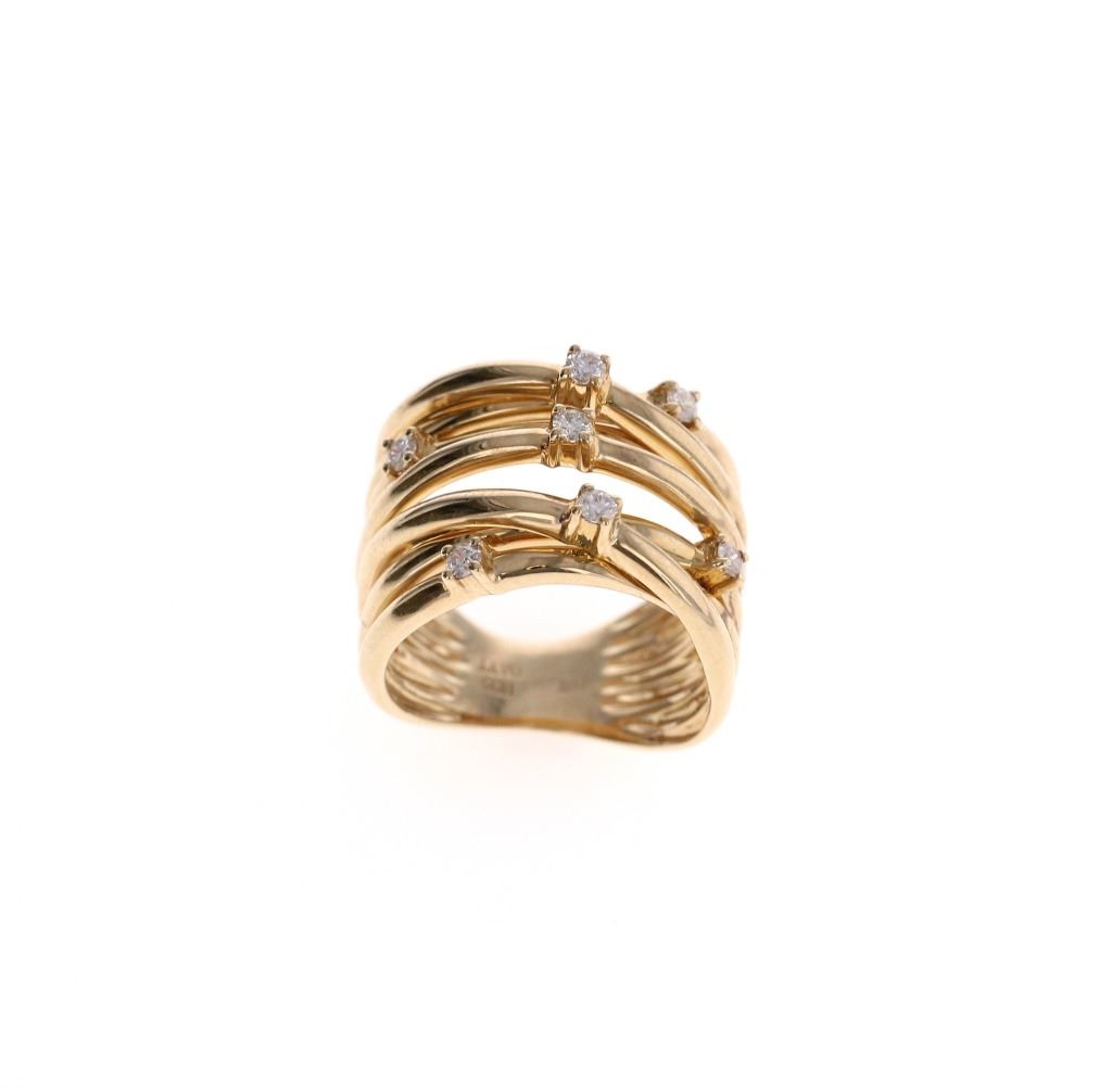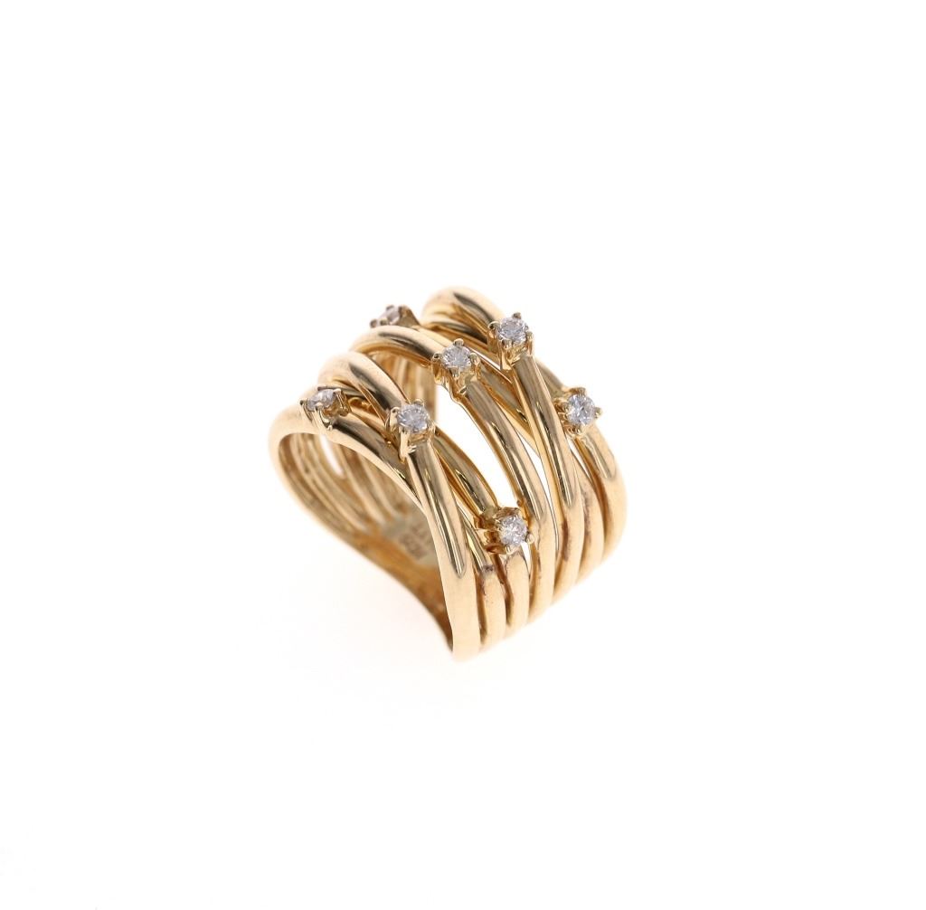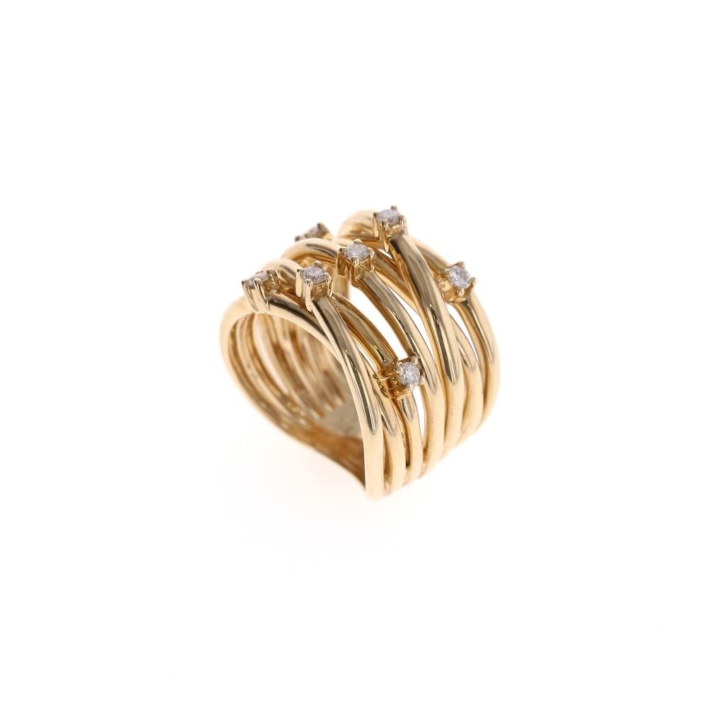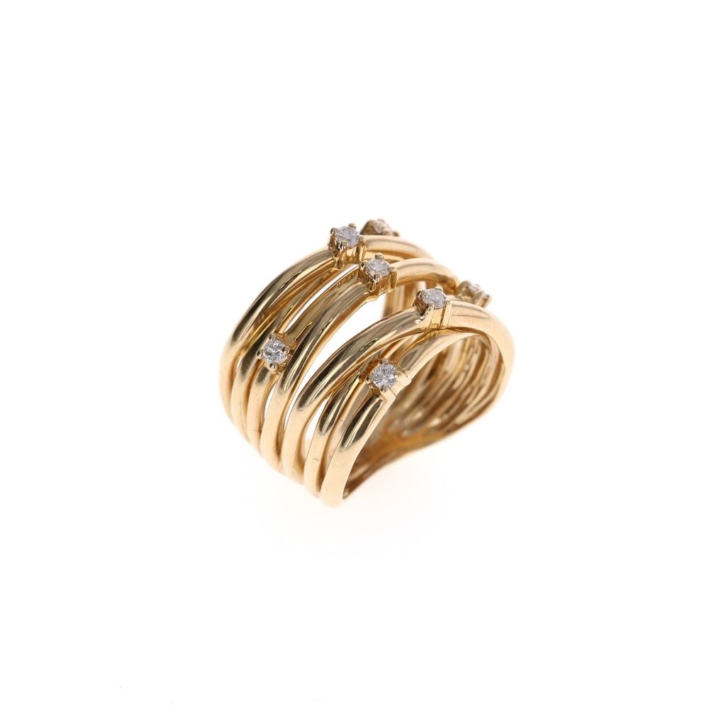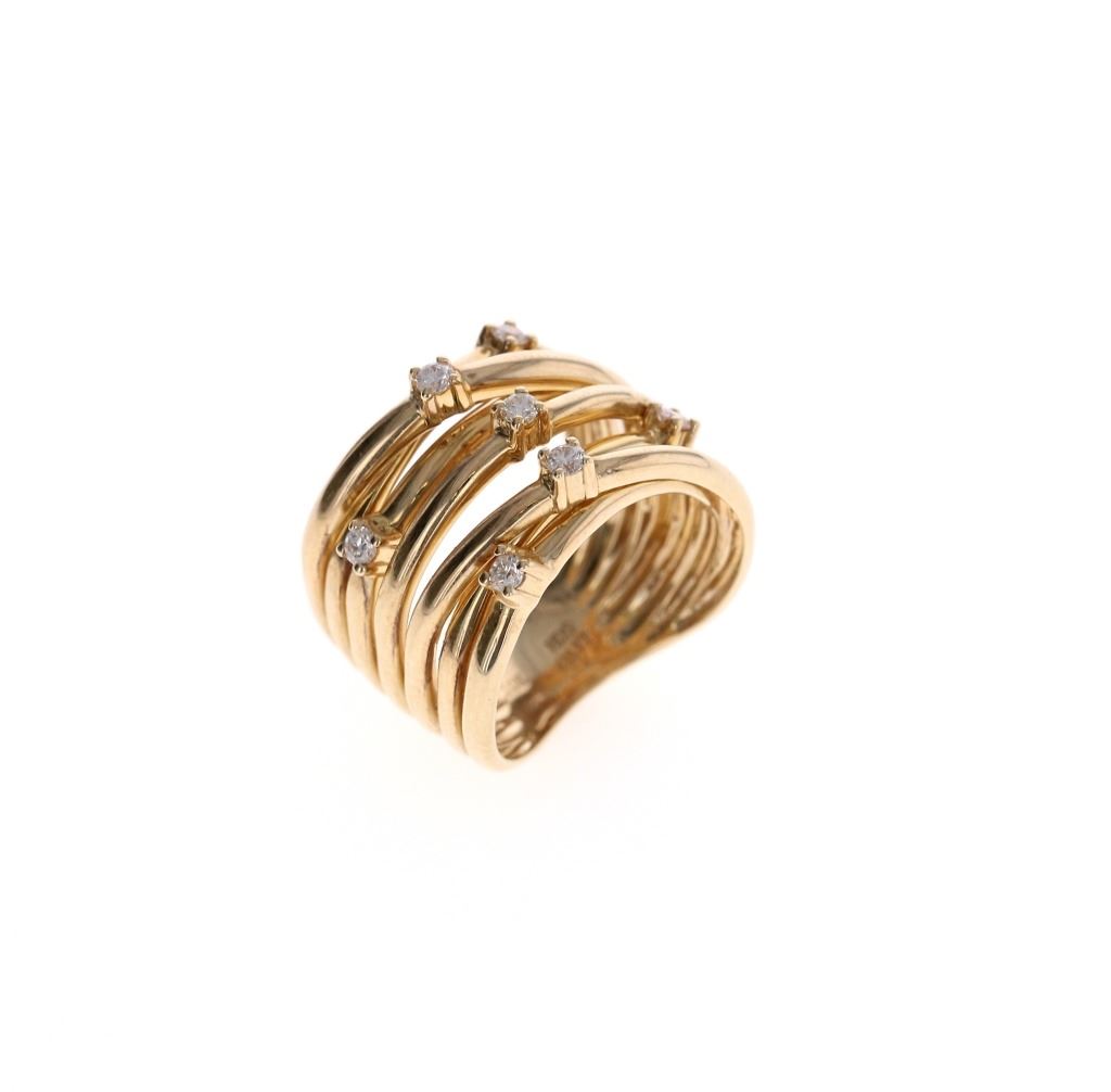 Featured in this lot is this multi band diamond and 10k yellow gold ring. The ring features a wonderfully and professionally crafted 10k yellow gold construction that features seven intertwined bands that are decorated with a total of 7 round brilliant cut diamonds that have good eye clarity and a total diamond weight of 0.28 carats. The ring features 'HDS OAYT' hallmark and shows a '10k' gold stamp on the inside band of the ring. The ring size is US 7 1/4.