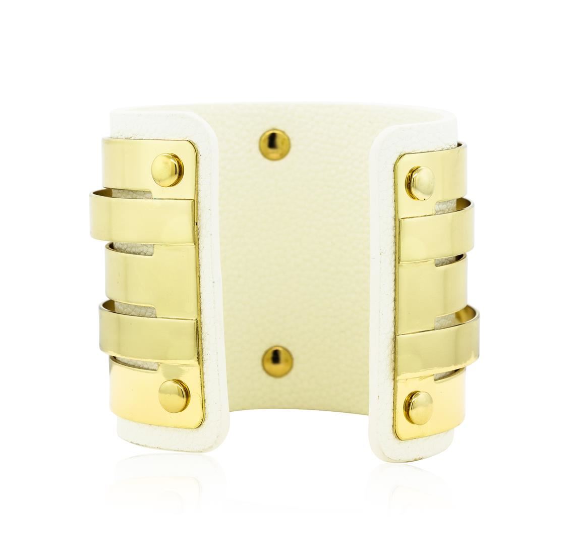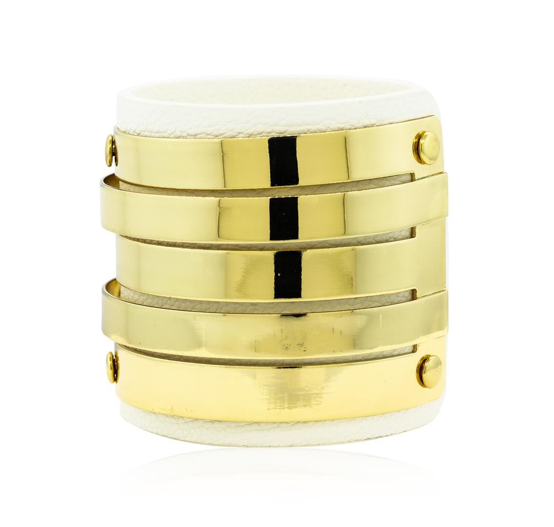 High end designer jewelry. Multi Bangle Design Cuff Bracelet - Metal and Leather. Metal& Leather Bracelet. White/gold. One Size.