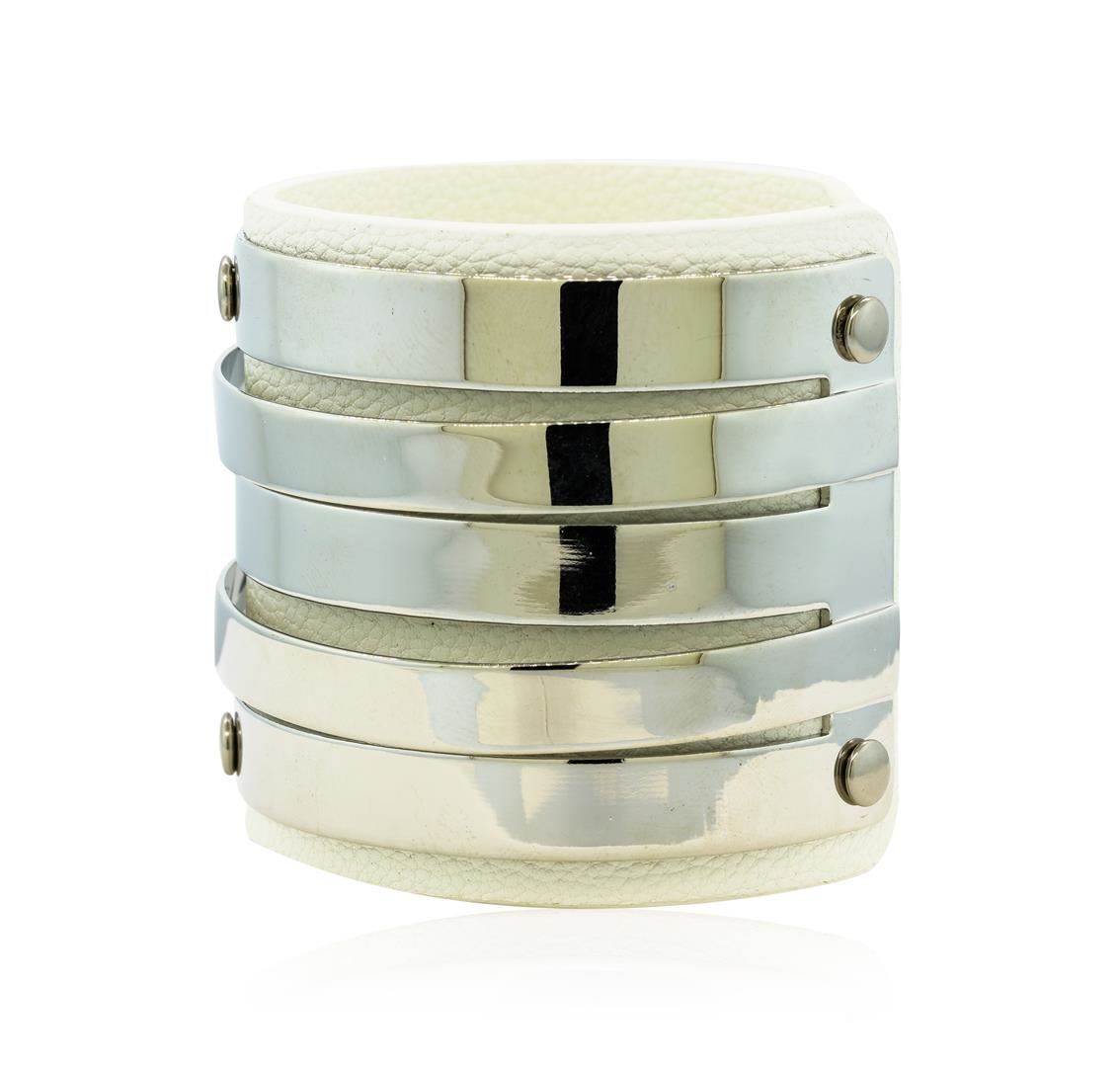 High end designer jewelry. Multi Bangle Design Cuff Bracelet - Metal and Leather. Metal& Leather Bracelet. White/ Silver. One Size.
