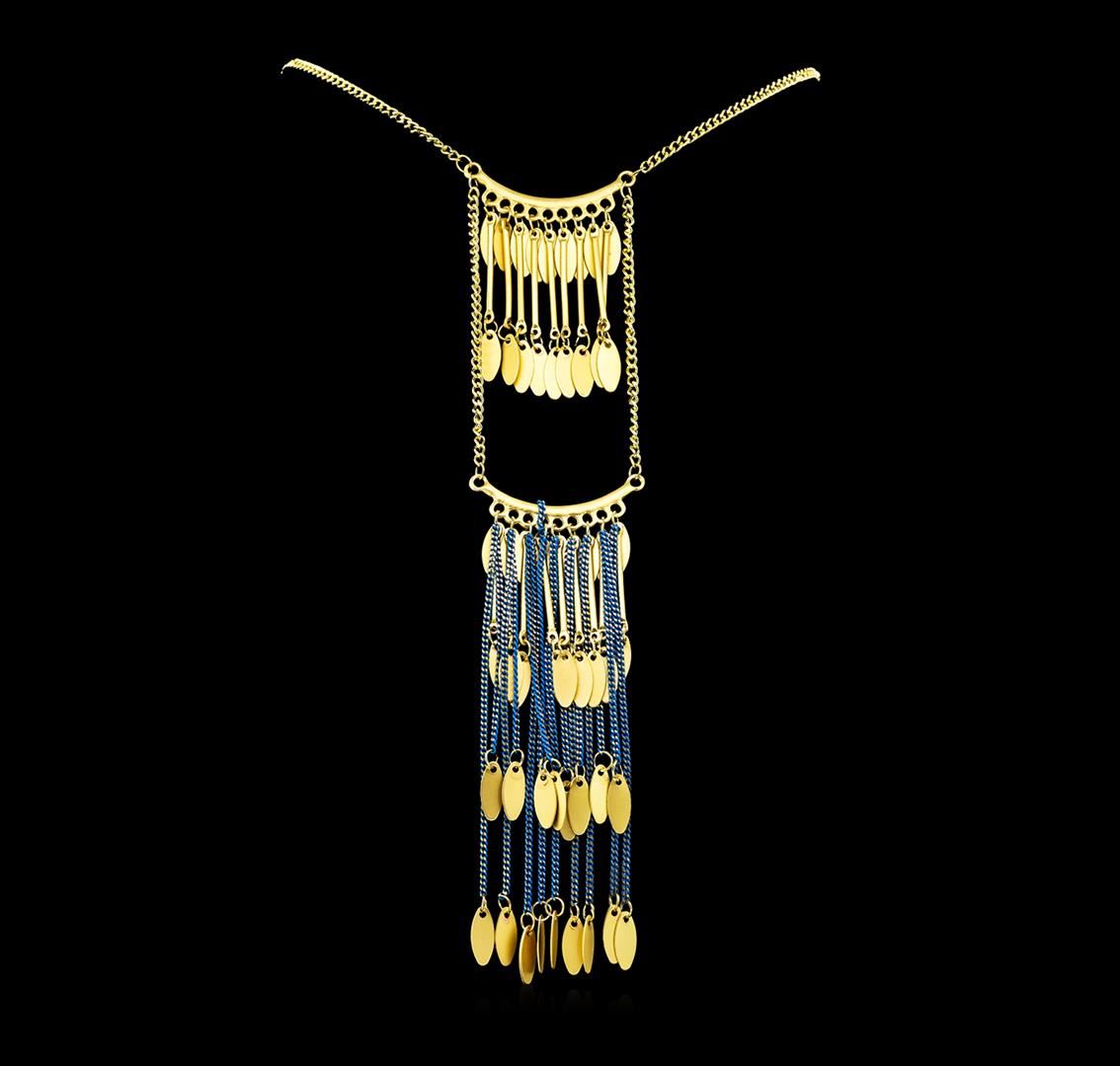High end designer jewelry. Multi Chain Necklace - Gold Plated. Gold Plated Chain. Gold/ Blue. Long. Total Weight: 31.3 grams.