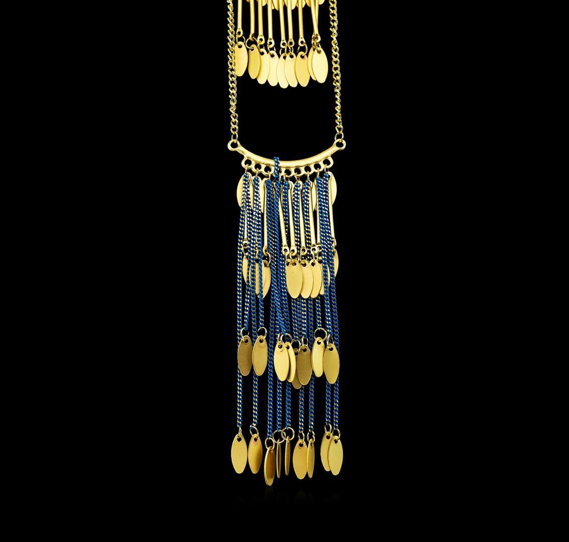 High end designer jewelry. Multi Chain Necklace - Gold Plated. Gold Plated Chain. Gold/ Blue. Long. Total Weight: 31.3 grams.