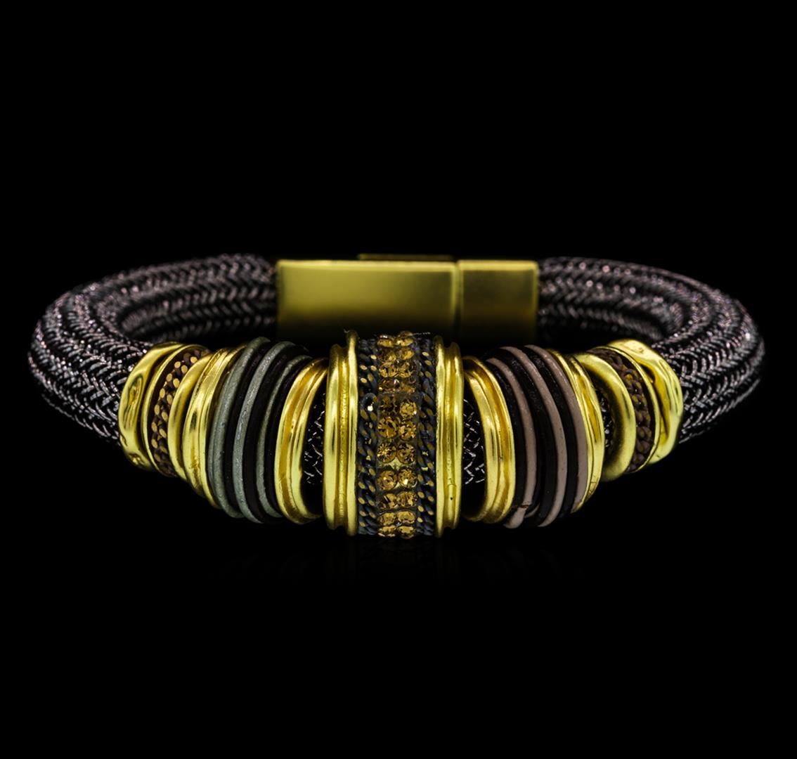 High end designer jewelry. Multi Charm Design Lurex Bracelet - Gold Plated. Gold Plated Metal/ Mag Clasp. Brown/ Gold. 7.8inches.