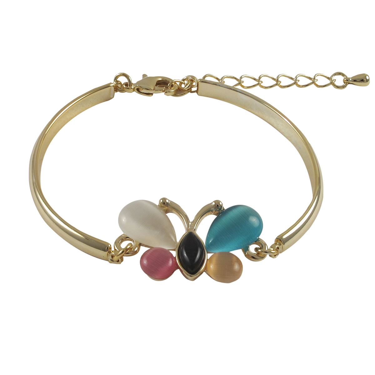 Multi Color Cat's Eye Stone Butterfly, Gold Plated Brass Bangle Bracelet, 7" 1"