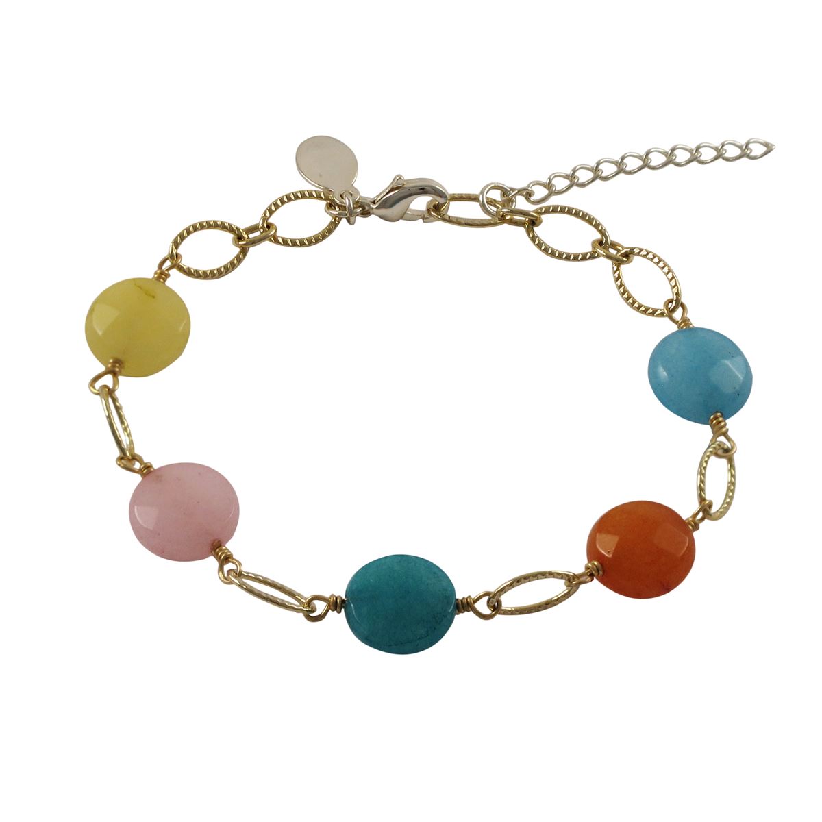 Multi Color Combination Semi Precious 10Mm Round Flat Stones On Gold Plated Brass Link Chain, Bracelet, 7" 1"