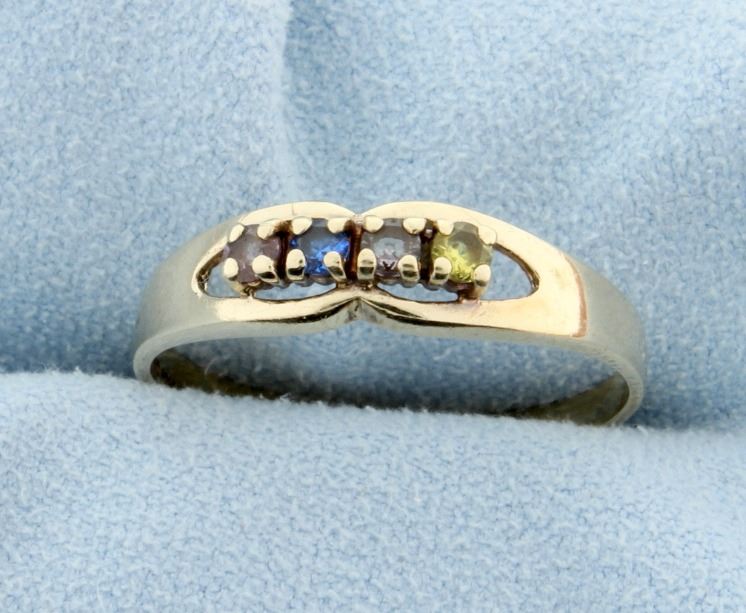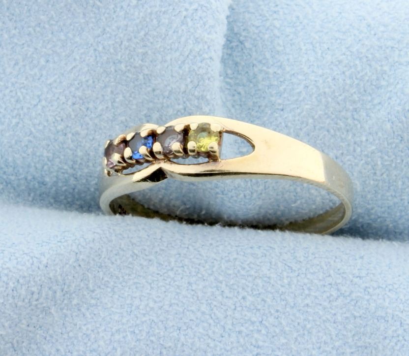 In 10K yellow gold, it contains one .06ct round citrine, one .06ct round green amethyst, one .06ct round sapphire, & one .06ct round pink topaz. Size 10 3/4 2.1g