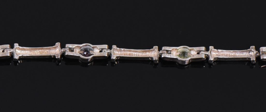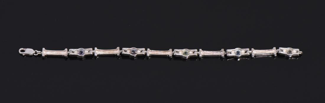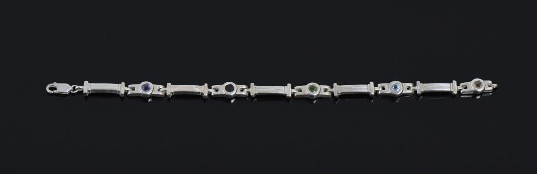 Multi Color Gem Stone Round Cut 925 Sterling Silver Bracelet. Estimated more than 50 yrs old. 925 Sterling Silver consisting of 92.5% silver and 7.5% copper. Tested Positive using Nitric Acid Chemical Scratch Test, Cloth Rub Test, Smell Test, and Magnet Test. Markings of 925 or Sterling stamp. The reason silver needs to be combined with other metals is that it is very difficult to make great designs with just pure silver, which is very soft and malleable. A bit of hardness has to be introduced by adding other metals such as copper. That is why jewelers are capable of making the most intricate an complex designs with 925 Sterling Silver. Silver is one of the most valuable elements next to gold. Mexico is the leading producer of sliver, followed by the United States, Canada, Australia, Spain, Peru, and Russia. Many countries do not require their precious metal items to be stamped and therefore we test to ensure we accurately represent the product. Size: See Ruler Photo. (Photos Represent The Condition Of The Lot.)