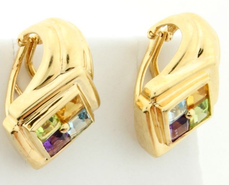 There are 8 gems in combinations of 4 Bezel set. There are square Citrine, Peridot, Amethyst and blue Topaz. Total gemstone weight 2cts. Almost 1" long x 5/8" wide! 8.8g