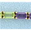 In 14K yellow gold, the bracelet contains six of each gemstone-blue topaz, peridot, amethyst, and citrine and seven garnet- all are 5x3mm emerald cut and have excellent color and clarity. The bracelet is 7 1/2 inches long with a safety clasp. 8.3g
