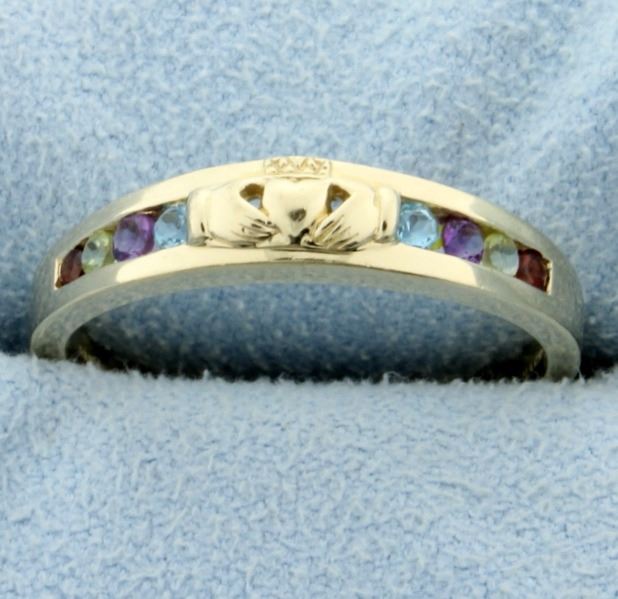 In 10K yellow gold, the ring contains two blue topaz, amethyst, peridot, and garnet gemstones. Size 9 1/4 2.4g