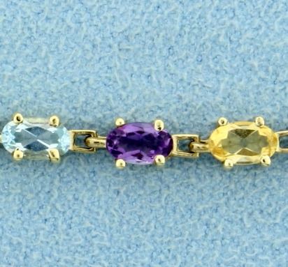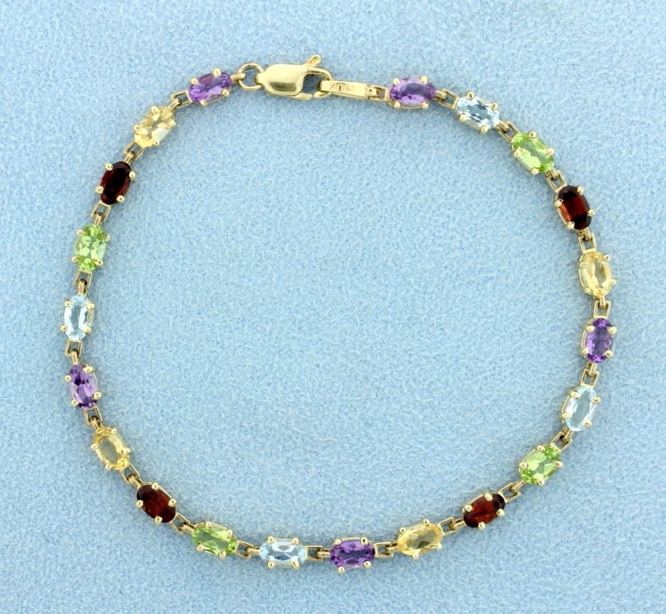 In 10K yellow gold. This bracelet contains five amethyst, four citrine, garnets, peridots, & blue topaz-all 5x3mm oval gemstones with excellent color and clarity. It is 7 inches long with a lobster clasp. 4.8g