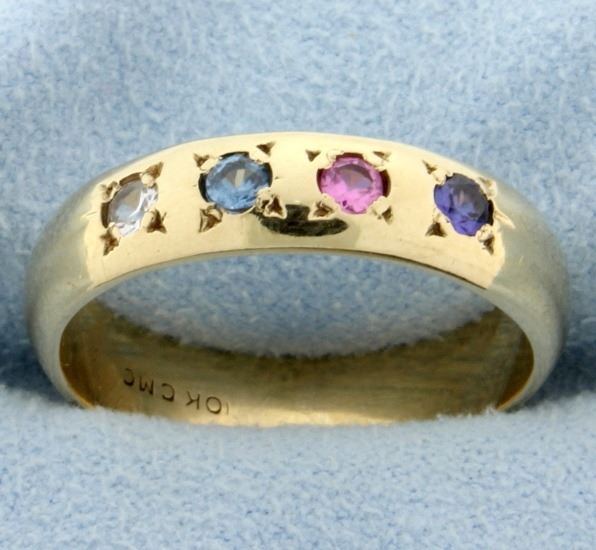 In 10K yellow gold the ring contains a 2.75mm white sapphire, blue topaz, pink topaz, & amethyst gemstones. Size 9 5.0g