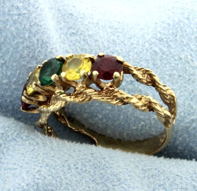 In 10K yellow gold it contains 4mm lab ruby, lab emerald, and citrine gemstones. Size 6 1/2 2.9g