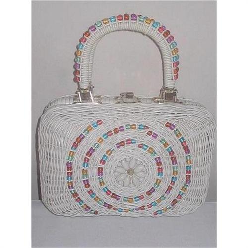 </font></strong>What a fabulous Handbag! So pretty. The label inside reads: Hand Made in British Hong Kong. The double handles are trimmed on the outside with a rainbow of multi-color lucite beads and the front has three swirls or circles of the multi-color lucite beads woven in with the white plastic coated wicker work of the purse. At the very center is a flower design of white beads and in the middle a gold tone etched bead. This handbag stands on four little gold tone feet. The lining is white plastic and there is one interior zippered pocket on the far wall of the purse and an open slip pocket on the other side of the purse. The label is sewn on to the open pocket. Measures 10" inches wide from east to west and stands 7-1/2" inches tall, excluding the carry handles, which add an additional 4-1/2" inches. The depth is 2-1/4" The closure is a twist lock close. Excellent condition, both inside and outside.</font>
