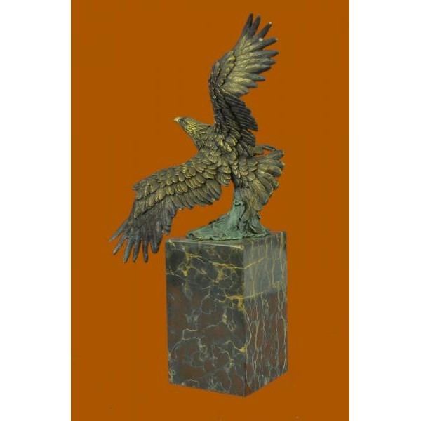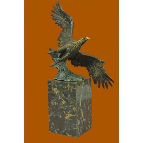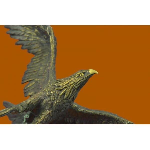 This eagle lets time pass by as he rests atop a nest, he watches carefully as his prey comes at close range. He sits peacefully and patiently as his claws are spread out giving him a perfect balance to fly off as soon as he sees potential food. His feathers are even and all in the same shape of an oval, his beak has a pointy and sharp look to it. this is a 100% bronze cast by using the age-old method of lost-wax casting and stained with a brown patina finish. It is mounted, along with its detailed bronze plinth, upon a marble base. Bronze dimensions with marble base: Height 12 X Width 10 inches. Weight: 8 lbs.