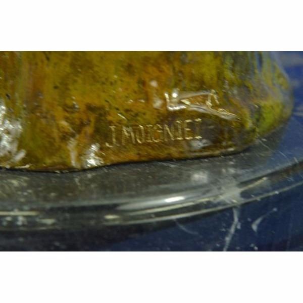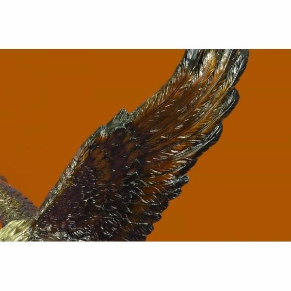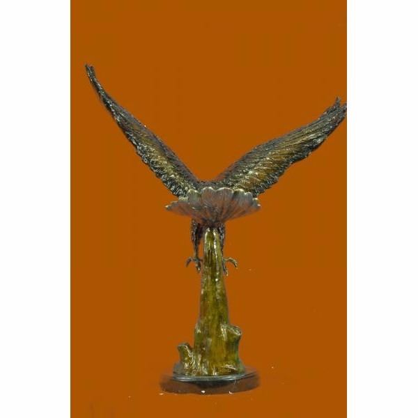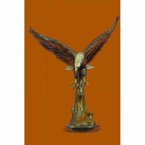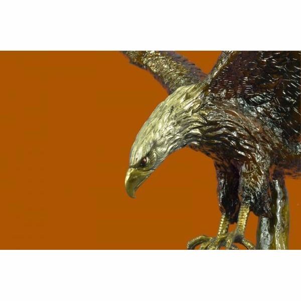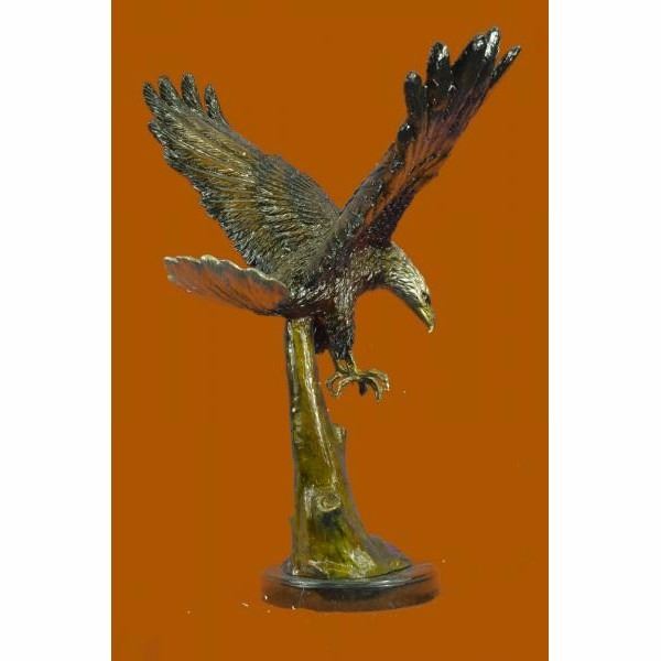 This is a beautifully detailed sculpture of the American bald Eagle. It swoops down from the sky and spreads his wings and claws to grasp a nearby branch. He swoops down and is versatile in this method of travel, reaching speeds of 5670 kilometers per hour (3543 mph) when gliding. His head and tail have a brilliant silver patina, his body a two tone brown, and his claws and beak a bright gold. He is a magnificent recreation of this powerful creature and the National symbol of the U.S.A. He represents resilience, power and strength but mostly it represents Freedom. He jumps off of a large broken tree which has a multi colored patina, his eyes red and each feather detailed, making it all look extremely realistic. Handmade using the ancient “Lost Wax Method†and sitting on a solid black marble base. Signed J. Moigniez. Condition: This sculpture is in perfect condition. Bronze Dimensions with Marble Base:Height 32" x Width 26" Marble Dimensions: Diameter 10" Height without base: 31" Weight :40 LBS Inventory : 27-57598NA23572