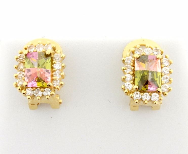 14k Multi color emerald cut green & pink quartz stones with a "halo" of white topaz around the multi color emerald cut shape centers. 7mm x 5mm approx. size. Great looking, unusual stones with French pierced backs! 5.2g