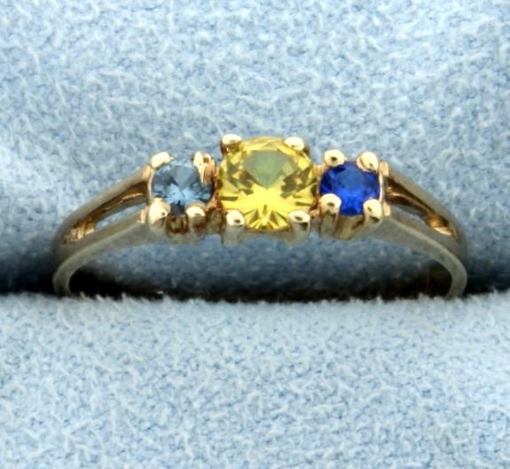 In 10K yellow gold, it contains a 4mm round citrine, a 2.5mm blue topaz & a 2.5mm lab sapphire. Size 6 1.4g
