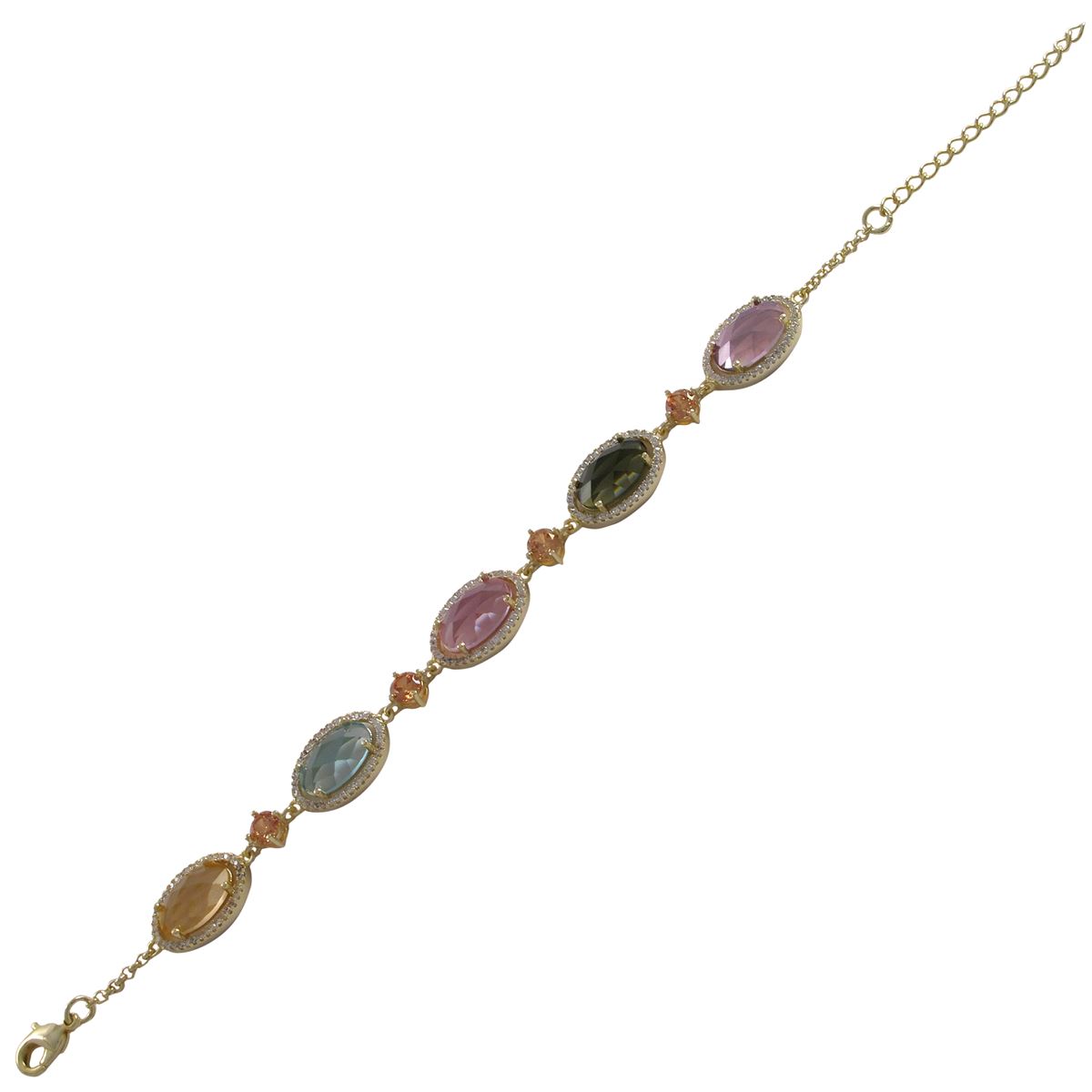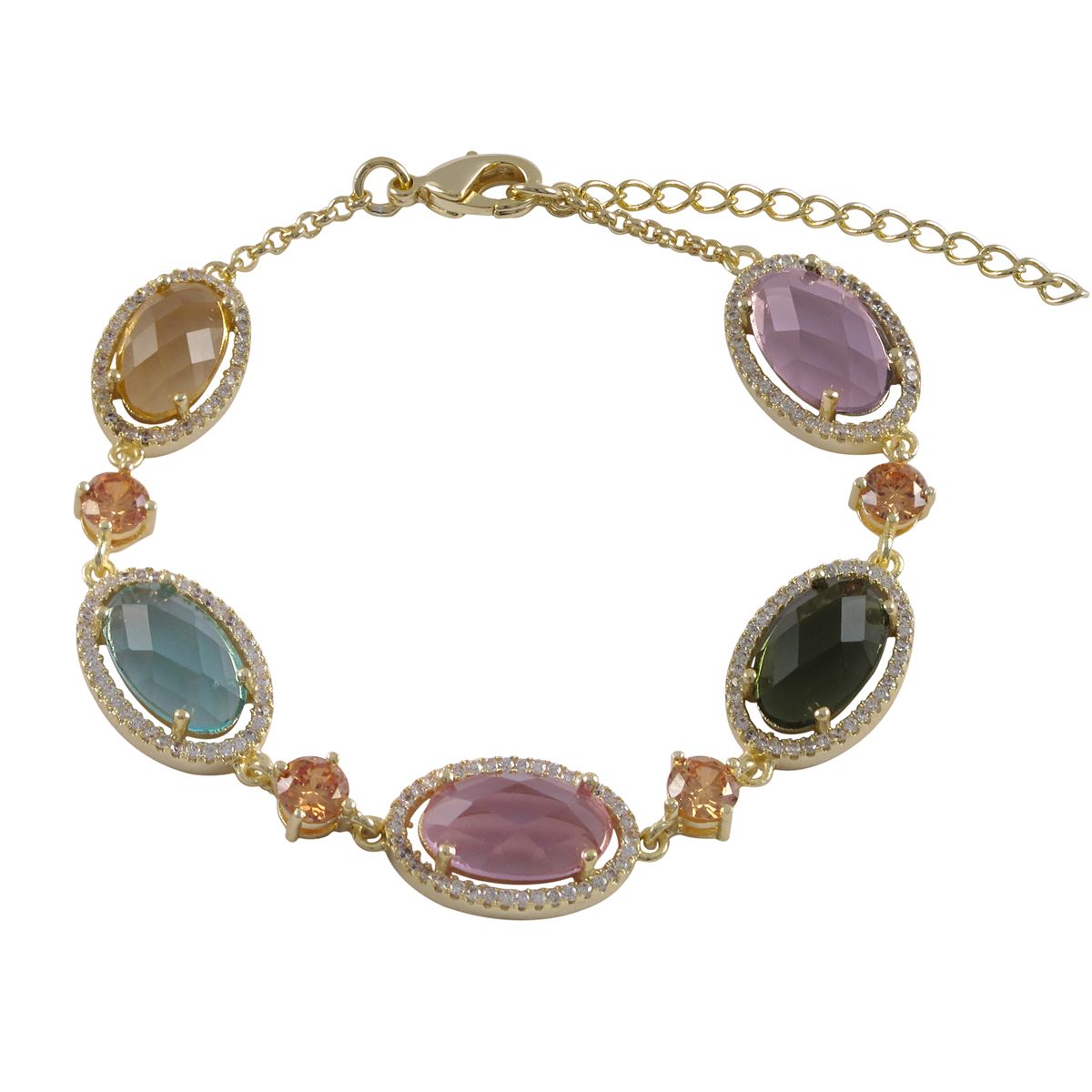 Multi Color Sliced Glass Oval Stones Set In Gold Plated Brass With CZ Border, Bracelet, 7.5 1