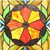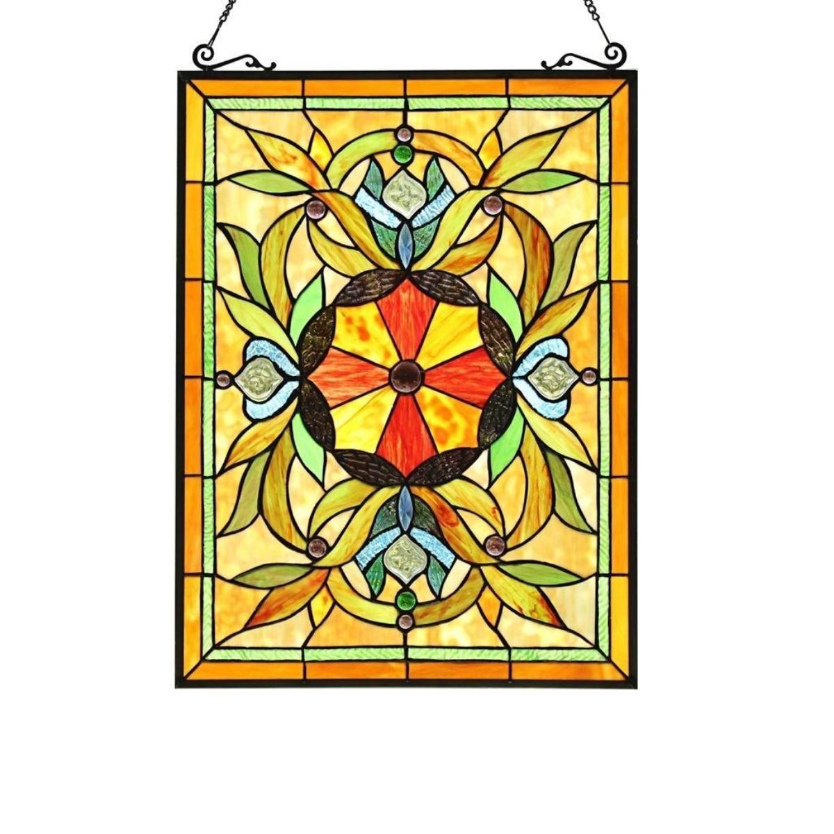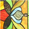 Multi-color stained art glass hanging window panel, created using 167 pieces of stained art glass, glass beads & crystals, wrapped in copper foil. 25" H X 18" W. Comes with hanging chain.