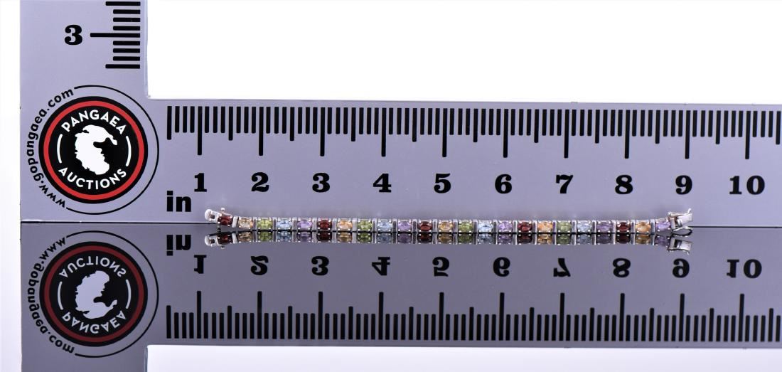 Multi Color Stone Sterling Silver Tennis Bracelet With Garnet, Citrine, Peridot, Blue Topaz, And Amethyst Stones. Estimated less than 50 yrs old. 925 Sterling Silver consisting of 92.5% silver and 7.5% copper. Tested Positive using Nitric Acid Chemical Scratch Test, Cloth Rub Test, and Magnet Test. Markings of 925 or Sterling stamp. The reason silver needs to be combined with other metals is that it is very difficult to make great designs with just pure silver, which is very soft and malleable. A bit of hardness has to be introduced by adding other metals such as copper. That is why jewelers are capable of making the most intricate an complex designs with 925 Sterling Silver. Silver is one of the most valuable elements next to gold. Mexico is the leading producer of silver, followed by the United States, Canada, Australia, Spain, Peru, and Russia. Many countries do not require their precious metal items to be stamped and therefore we test to ensure we accurately represent the product. For Size And Weight See The Last Photo If Not Written In This Description. All Photos Represent The Lot Condition. Please Read Our Terms And Conditions.