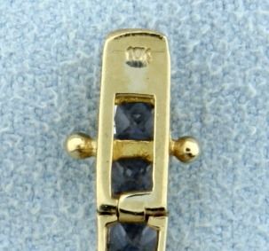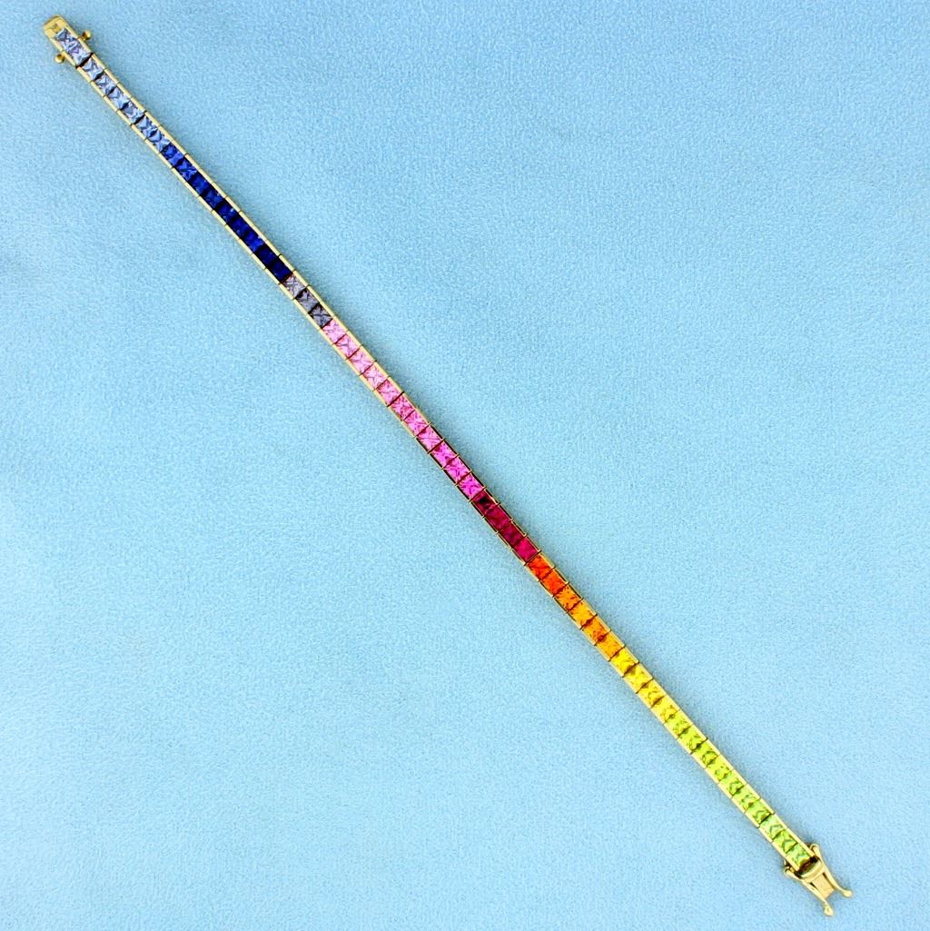 In 10K yellow gold, it is 7 1/4 inches long and contains fifty five 3mm square topaz gemstones of all colors. Beautiful color and clarity. Amost 10cts total weight of gems. The bracelet has a safety clasp.         9.9g