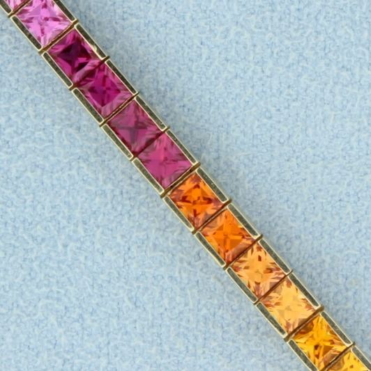 In 10K yellow gold, it is 7 1/4 inches long and contains fifty five 3mm square topaz gemstones of all colors. Beautiful color and clarity. Amost 10cts total weight of gems. The bracelet has a safety clasp.         9.9g