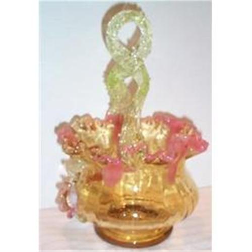 This vintage Victorian Hand Blown Art Glass Basket has a briar handle that is done is a lovely green glass and an amber basket that has applied flowers to the outside and pink glass in the corners of the inside of the basket. It is in SUPERIOR condition with no chips, cracks, dings and no loss to any of the applied floral decoration. It measures 5.50" in diamete rand stands a very stately 9" tall to the top of its twisted briar handle.