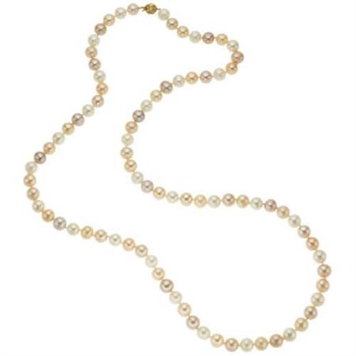 <B>Multi-Colored Cultured Pearl Necklace</B></I><BR><BR>The necklace is composed of cultured pearls in white, cream, peach and lavender with ros overtones, ranging in size from 10.00 - 9.50 mm to 9.00 - 8.50 mm, forming a single, knotted strand, completed by a 14k yellow gold corrugated clasp. (pearls not tested for origin of color). Gross weight 89.30 grams.<BR>Length: 32 inches<BR><BR> <B>Condition Report:</B> Normal signs of wear as appropriate with age.<BR><BR><b>Shipping:</b> Miscellaneous Collectibles, Smal (<a target="_blank" href="http://www.heritageauctions.com/common/shipping.php">view shipping information</a>)