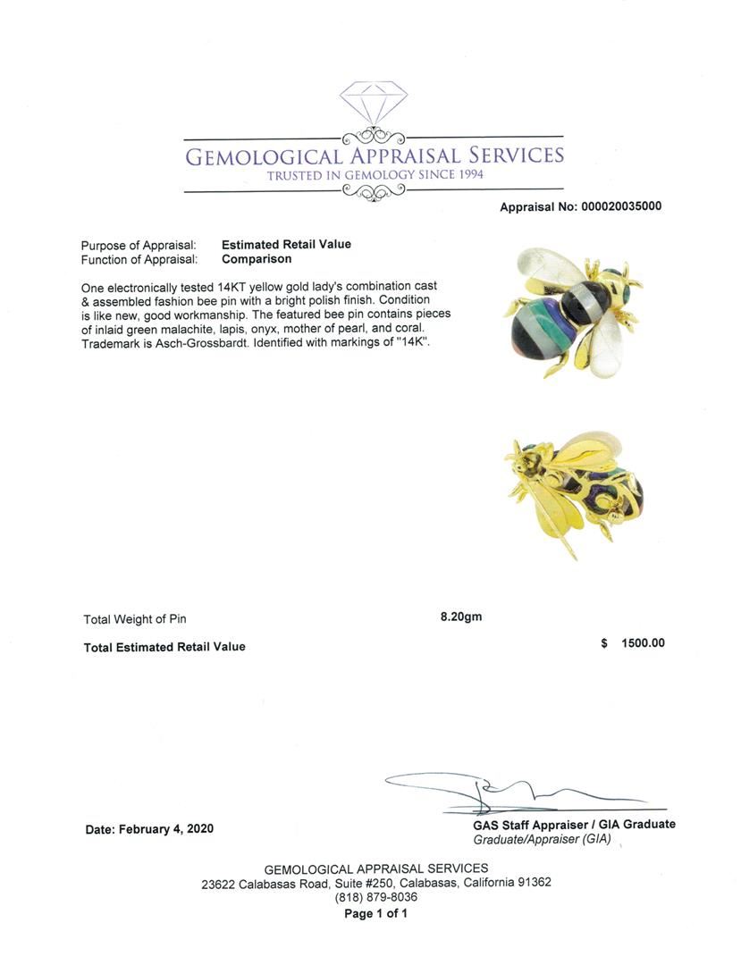 One electronically tested 14KT yellow gold lady's combination cast & assembled fashion bee pin with a bright polish finish. The featured bee pin contains pieces of inlaid green malachite, lapis, onyx, mother of pearl, and coral. Trademark is Asch-Grossbardt. Identified with markings of '14K'. Condition is like new, good workmanship.. Total Weight of Pin 8.20gm GAS Appraised at $1500.00. GAS Appraised.