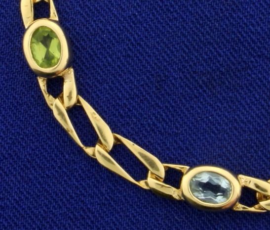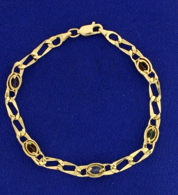In 14k yellow gold. 7" long with lobster clasp. Contains five high quality .5ct oval shaped natural gemstones: garnet, peridot, sky blue topaz, citrine, and amethyst. All have bright colors and excellent clarity. 6.2g.