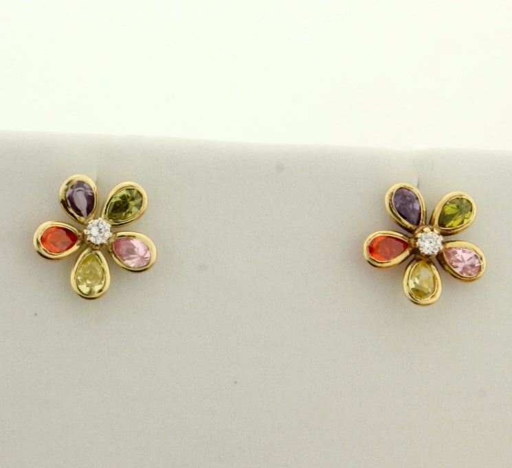 In 10k yellow gold. Contains a rainbow color of natural gemstones including pink topaz, garnet, amethyst, and citrine. No backs. 0.4g.