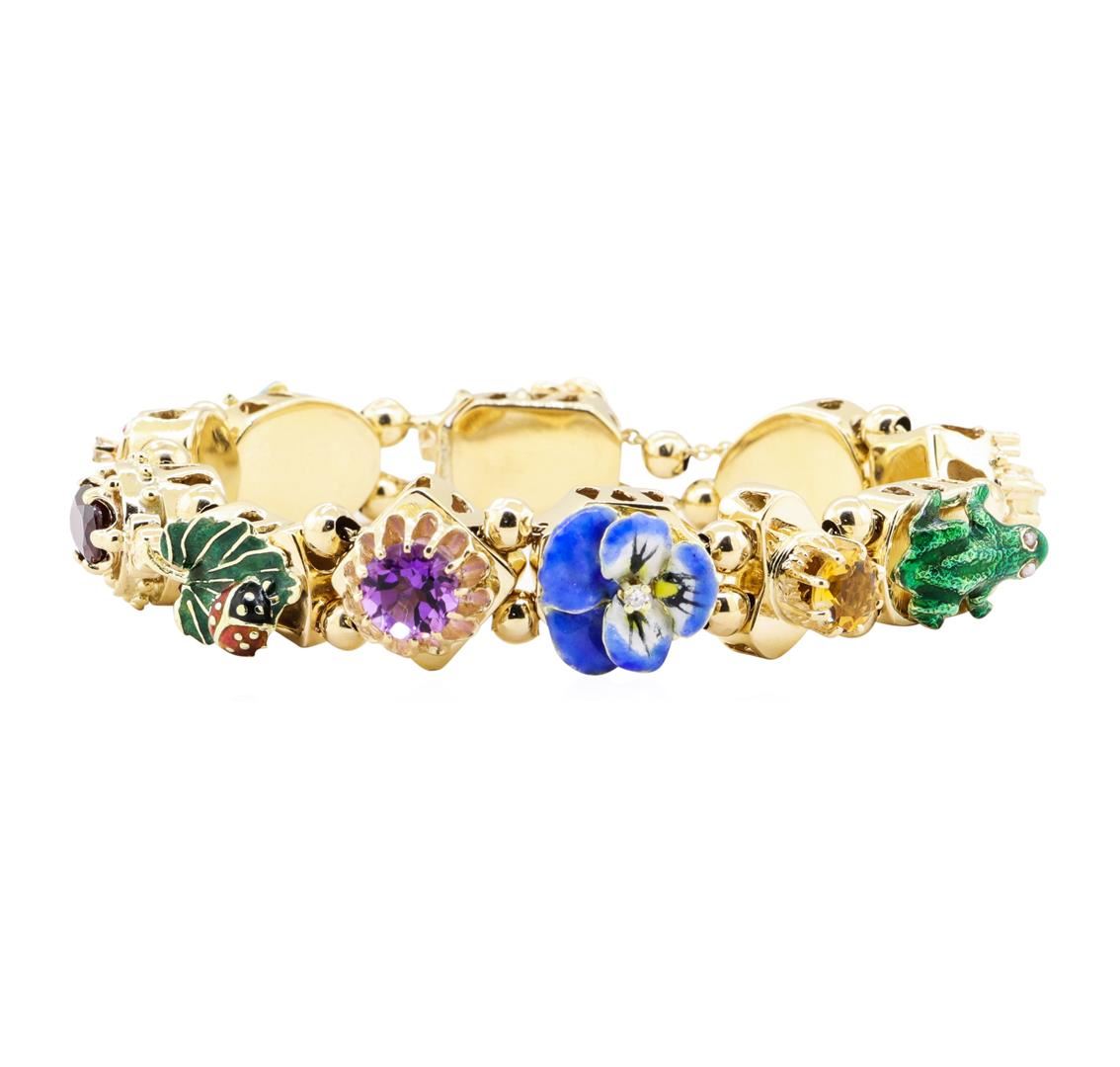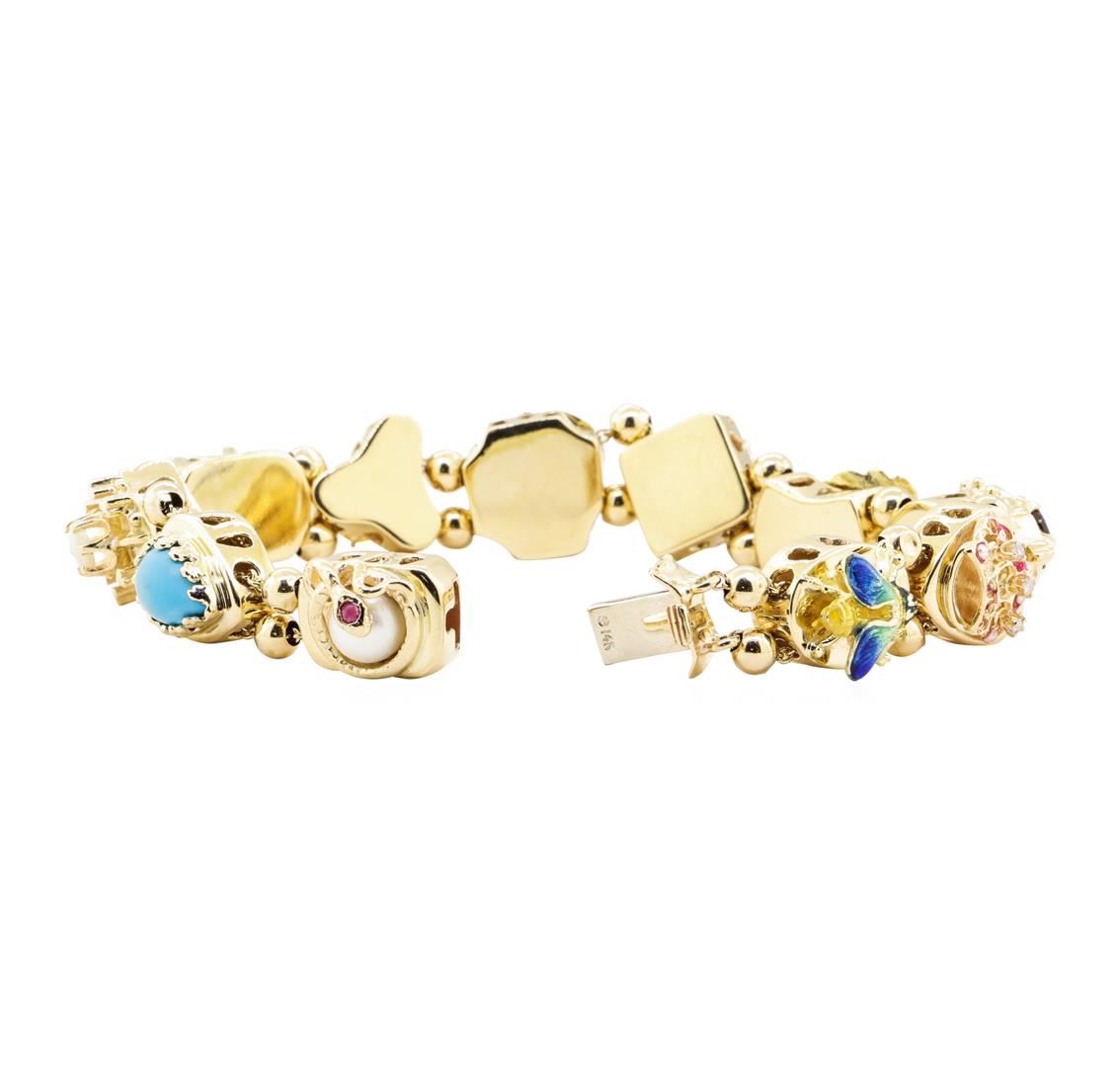 One vintage slide bracelet with eleven charms featuring: 14KT yellow gold weighing 36.9 grams. The bracelet measures seven inches in length.