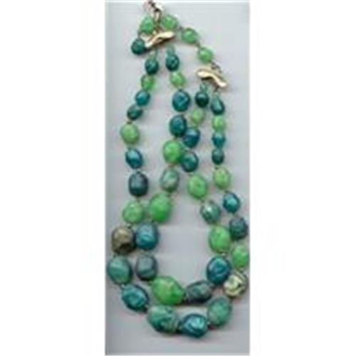 The colors on this 2 strand plastic bead necklace remind me of a forest with the differing colors of the trees and grasses. This necklace should match about any color of green in your wardrobe. The length around the neckline is 20 inches. There is a signed, CORO, hook style clasp. There is some metal wear on the goldtone metal fittings.