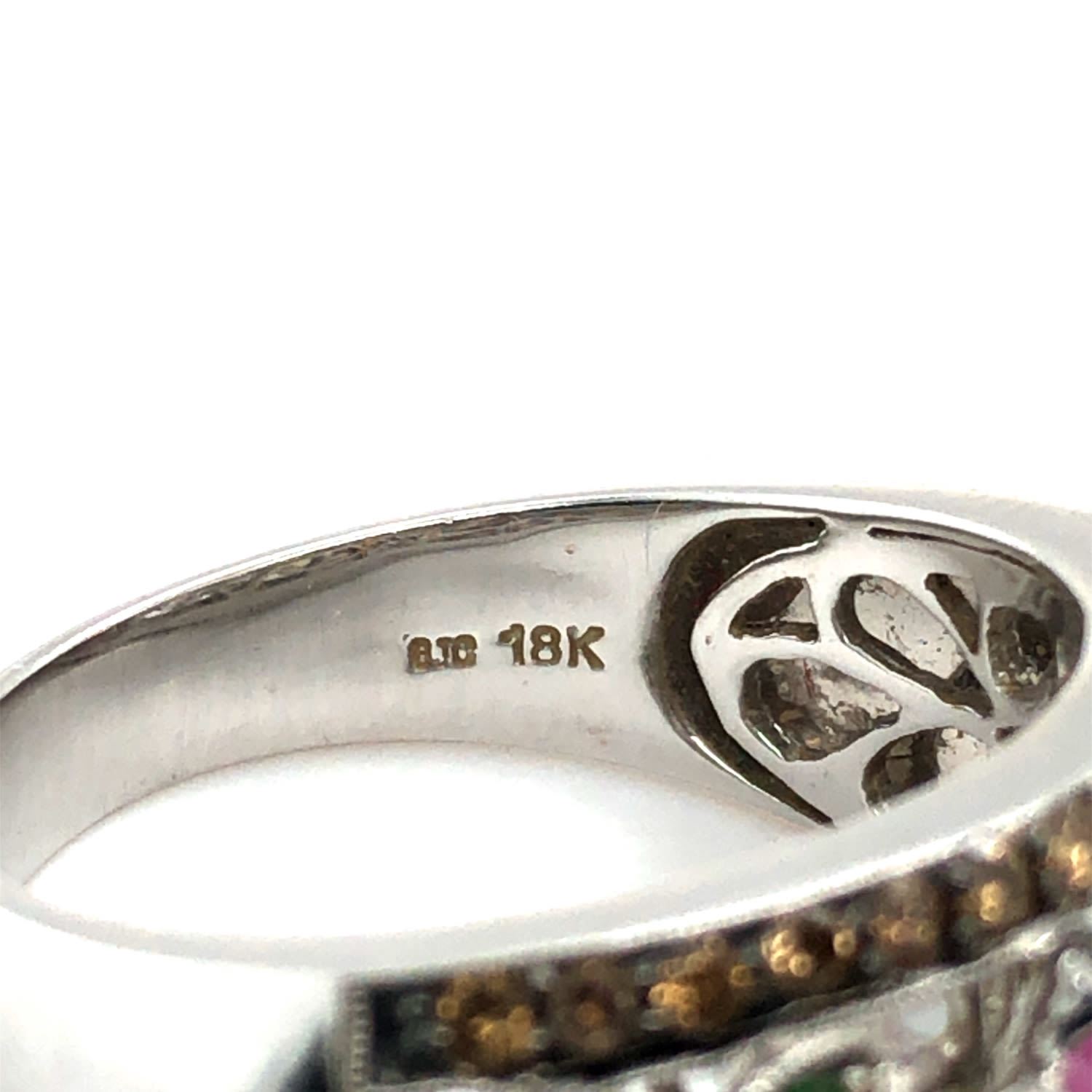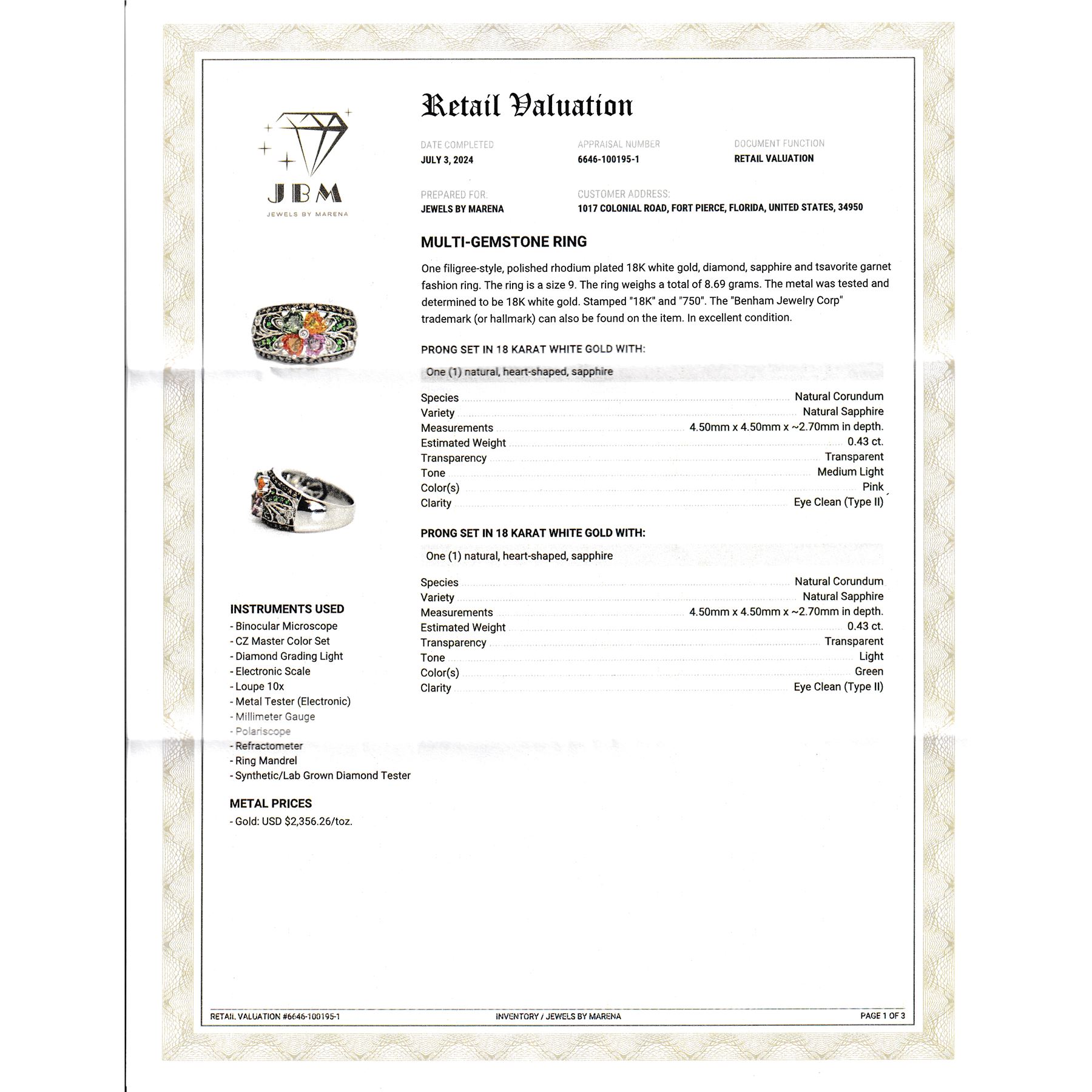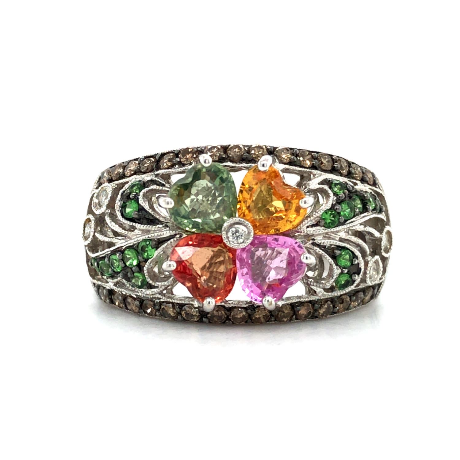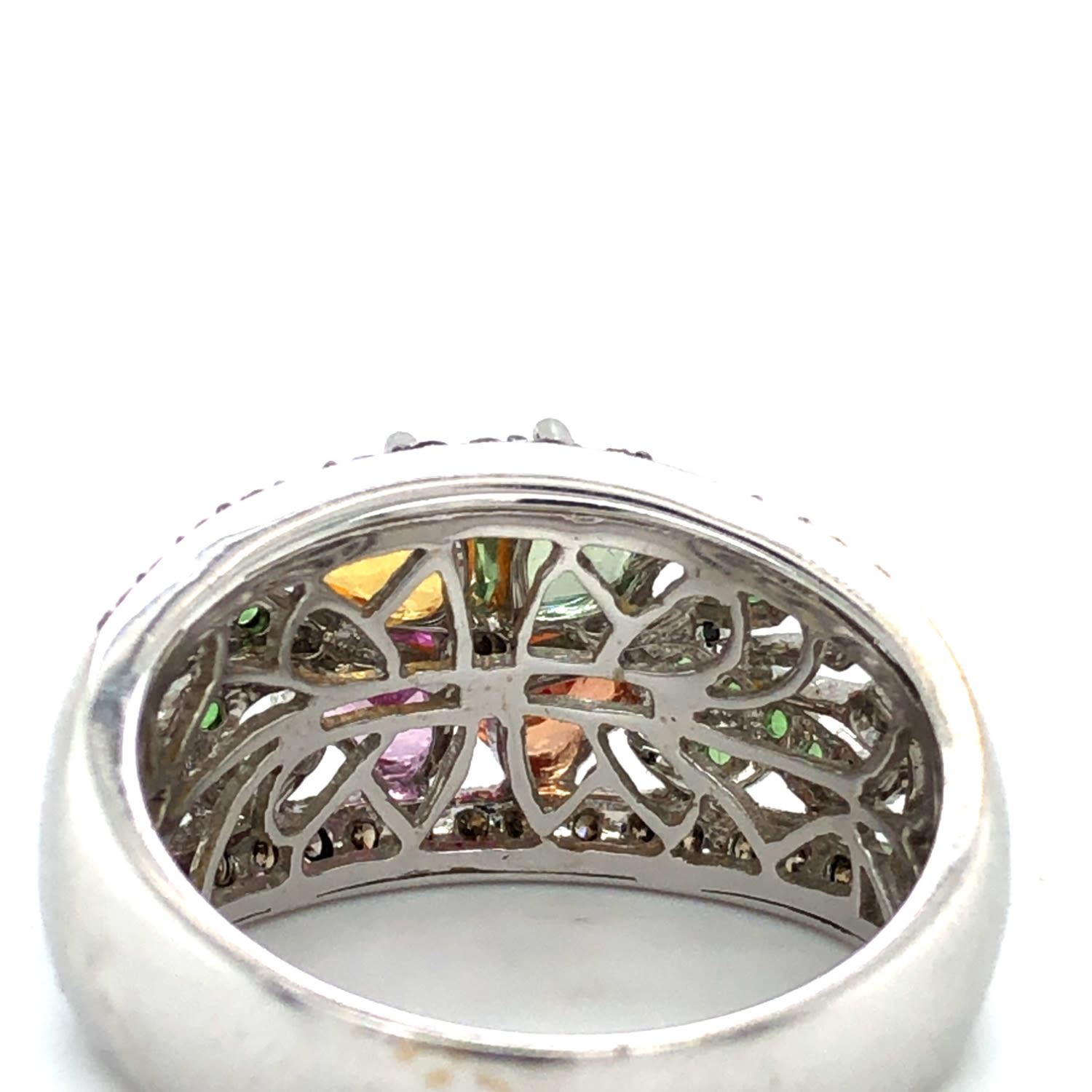 DESCRIPTION DETAIL: This ring includes an incredible array of natural Gemstones including Pink, Green, Orange & amp; Yellow Sapphires. They are surrounded by beautiful natural Tsavorites as well as natural colorless and fancy brown Diamonds.