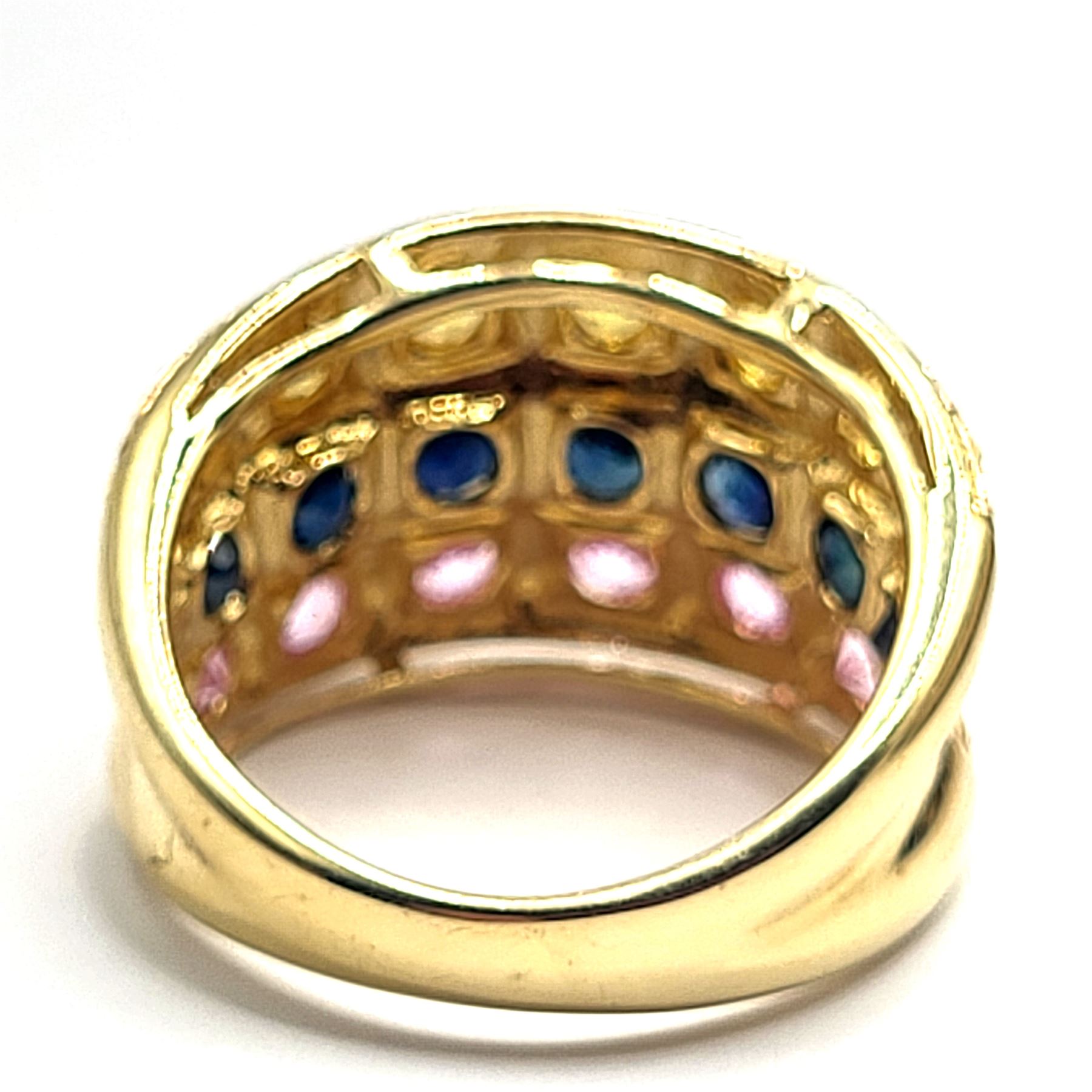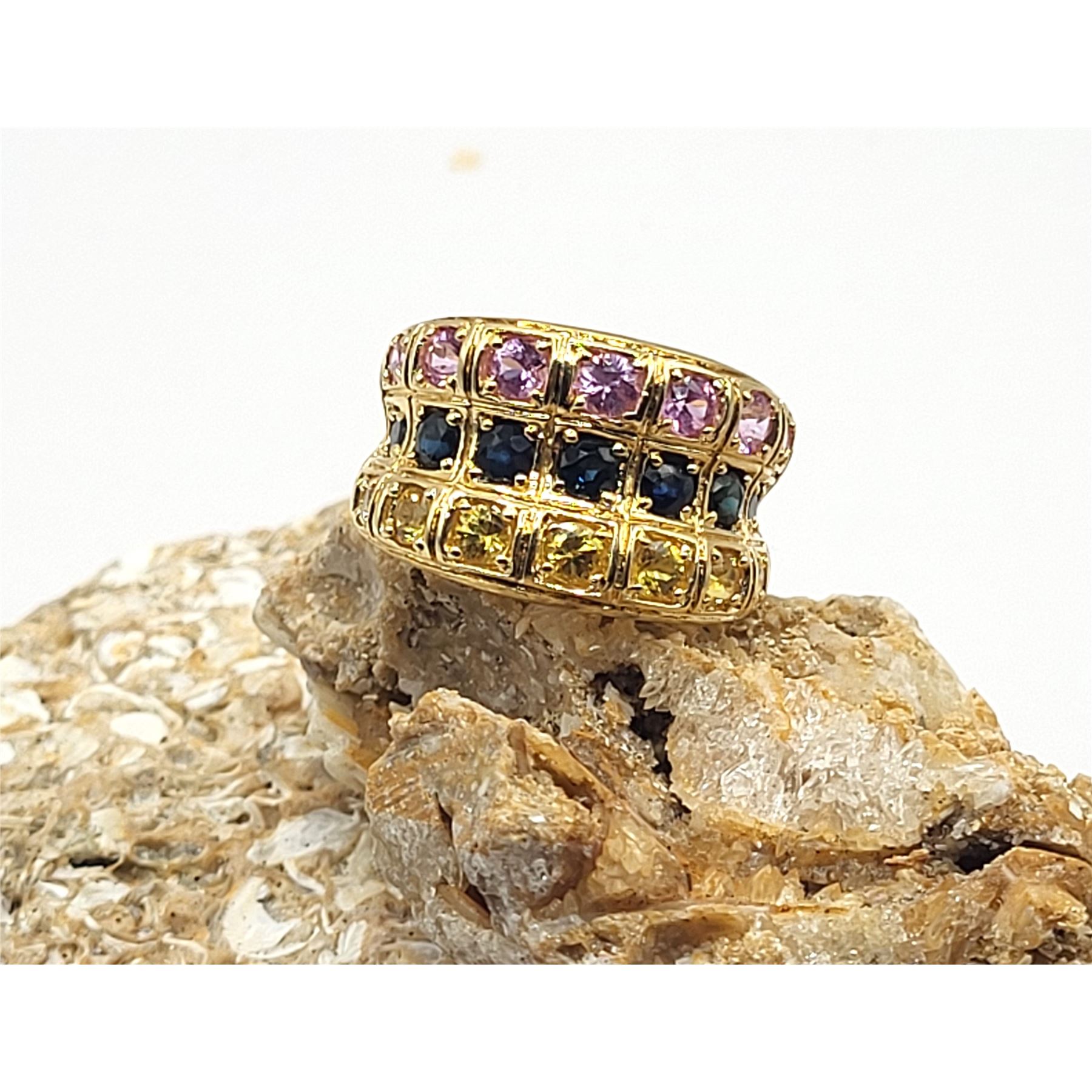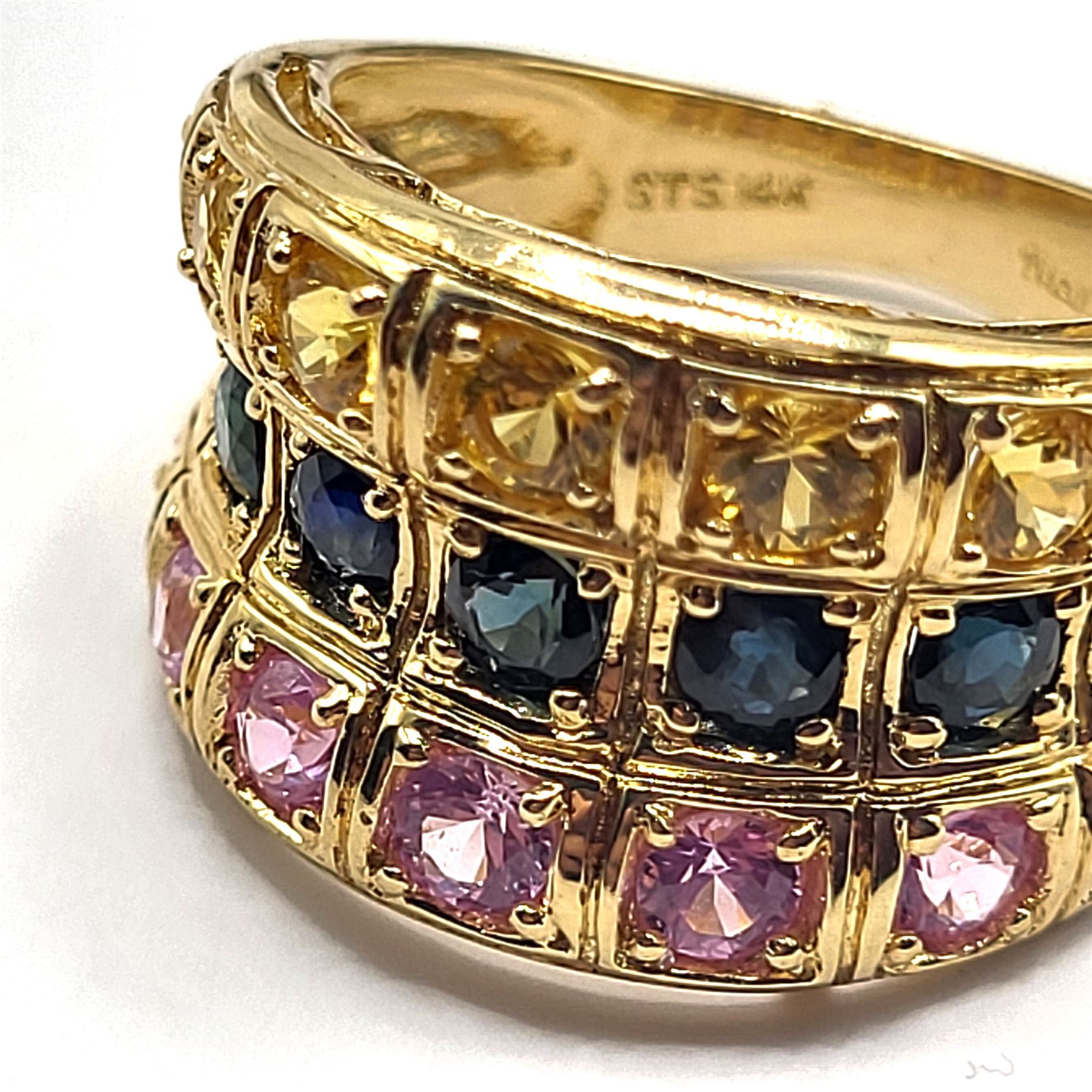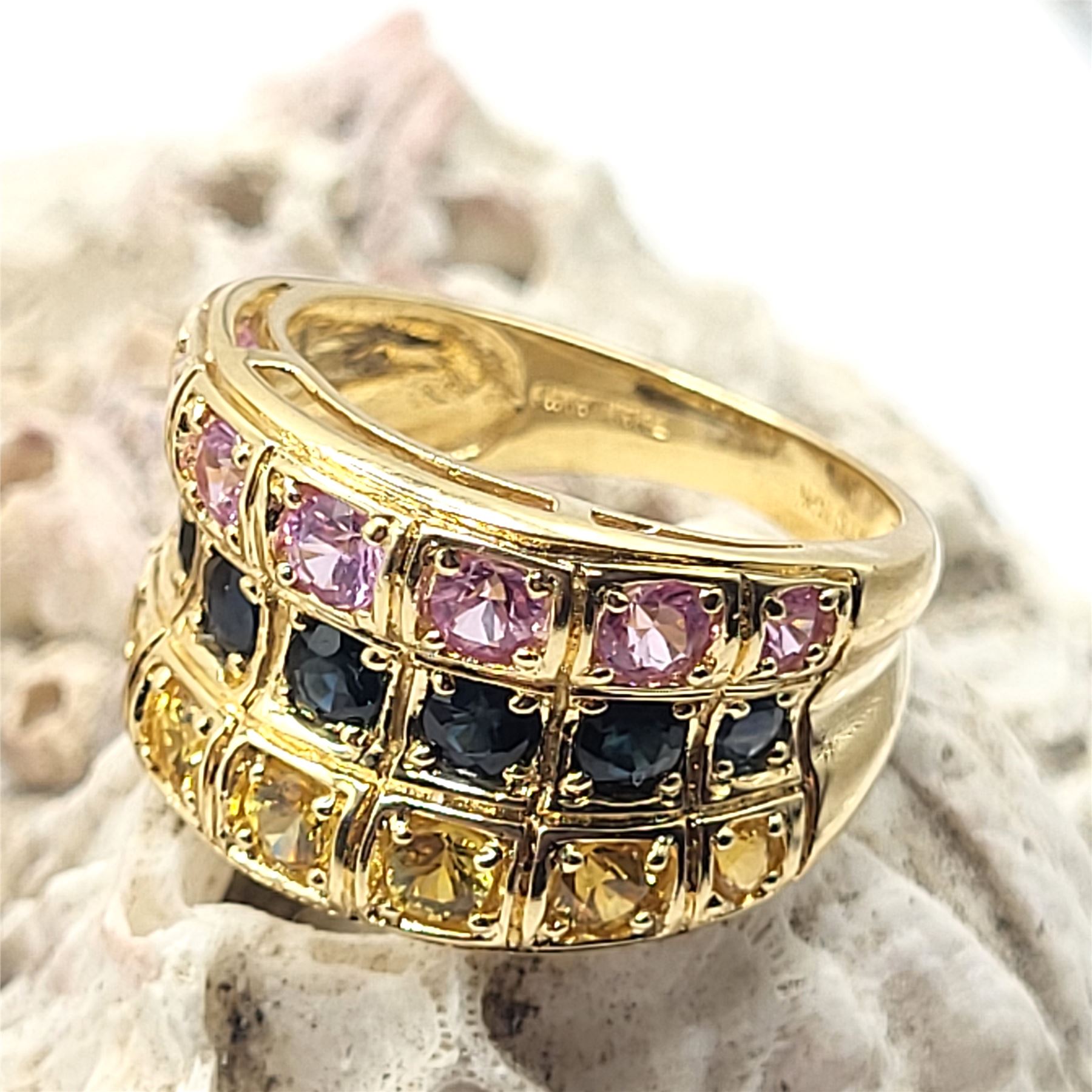 This 14 karat yellow gold ring features corundum. And lots of it! There are approximately 4.00 carats total weight of genuine sapphires in this wide, concave band. The center row displays genuine, navy blue sapphires, while the outer rows sensationalize the fancy sapphires with yellow and pink. This ring tapers from approximately 13mm at the top to 3.5mm at the bottom and is US size 7. See sizing details and other information below. Admin:33109/20ihl