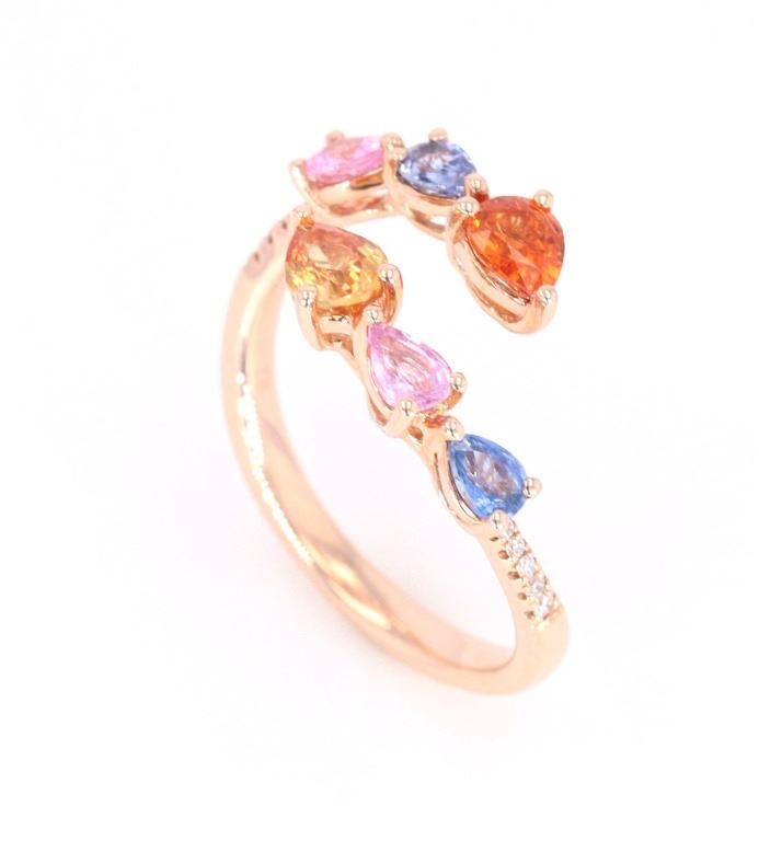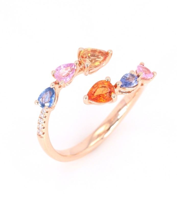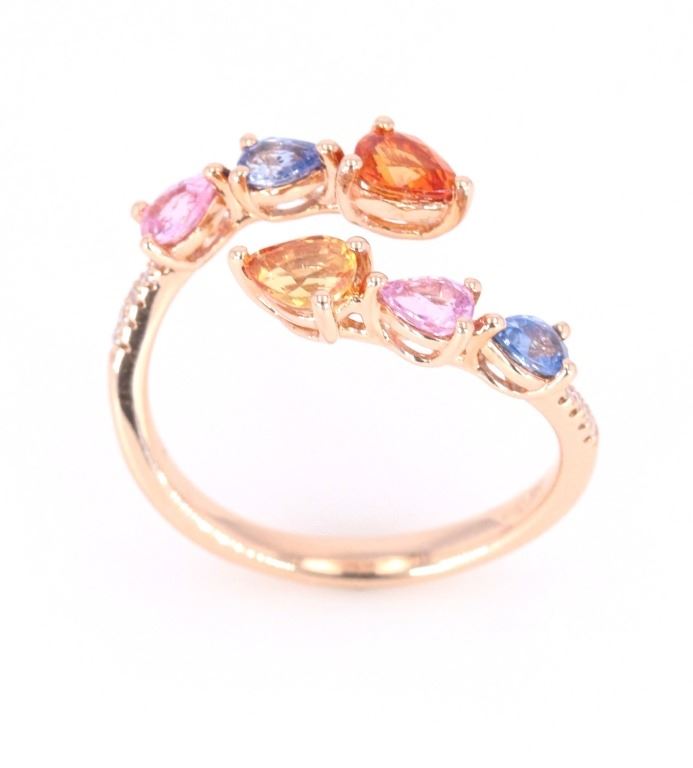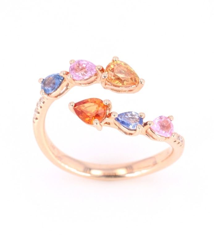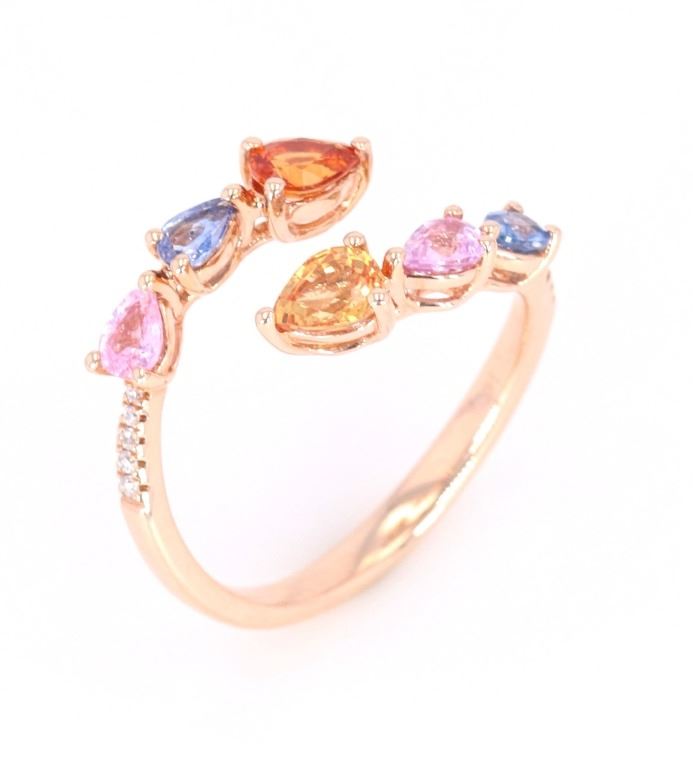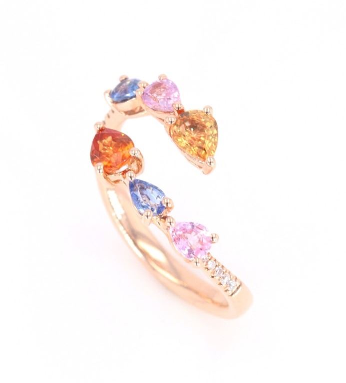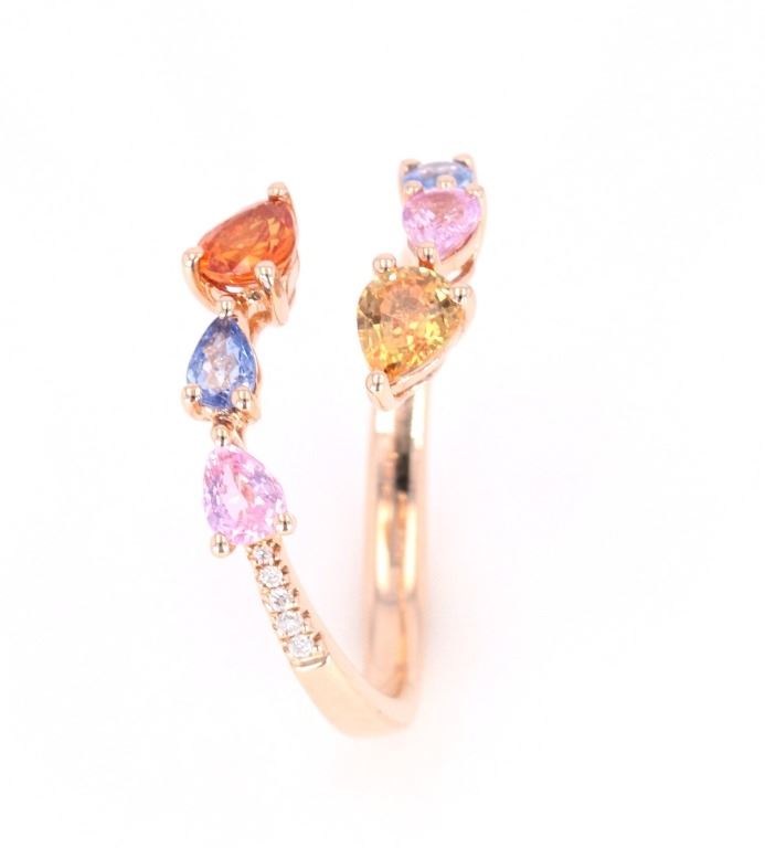 The ring shows a beautiful double strand of six Sapphire exhibiting multiple colors being set with Diamonds in 14K Gold. The ring shows a total of six pear cut natural Sapphires in multiple colors such as orange, pink, blue, and yellowish orange. The band itself is a very unique design showing the central sapphires section open and not connected. The shoulders are set with 10 round brilliant diamonds with a weight of 0.04 carats. Ring has a 14 karat yellow gold weight of 2.31 grams and is in a size of 7 US.