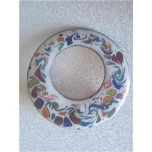 </font></strong>This is a lovely Multi Colour brooch with a rainbow of all different colours that shimmer beautifully when caught by the light. It is set on a white background. Modernist design it is enamel over copper and is signed on the back by the artist's initials HEB and Canada. Measures 1-1/2" inches in diameter and it is in excellent condition. </font>