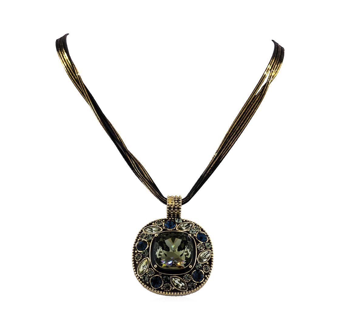 High end designer jewelry. Multi Crystal Bezel Necklace. 3- Strand(2 Tone) Chain. Blk/ Gld/ Mult. 20/1.5inches.