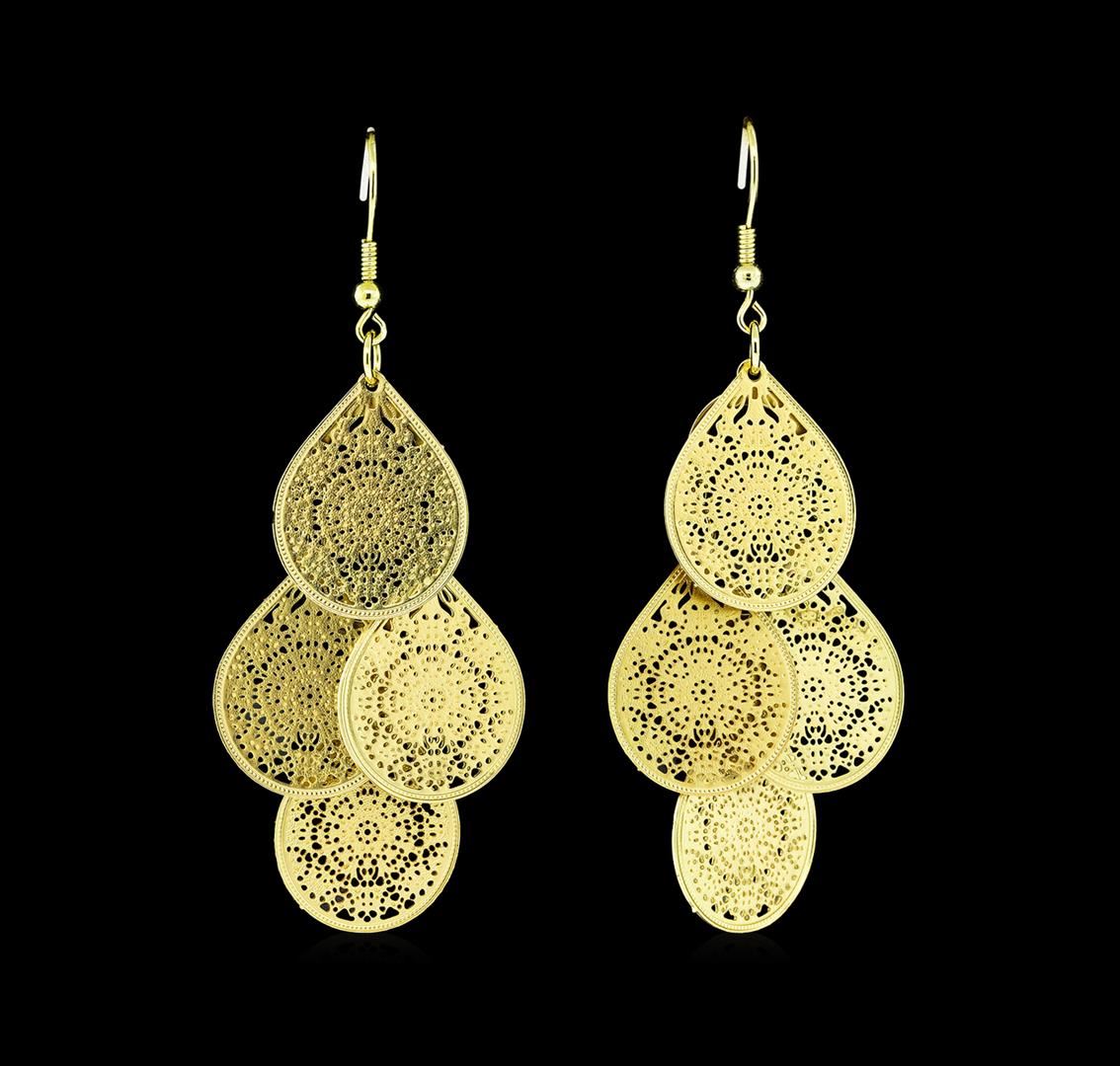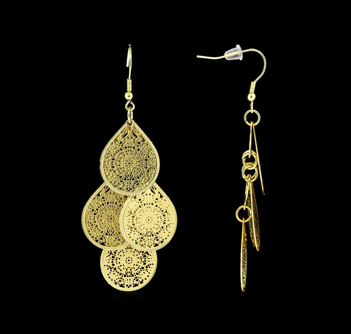 High end designer jewelry. Multi Disc Charm Earrings - Gold Plated. Gold Plated Chain. Gold. Hook. Total Weight: 7.2 grams.