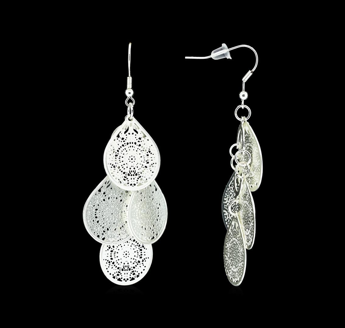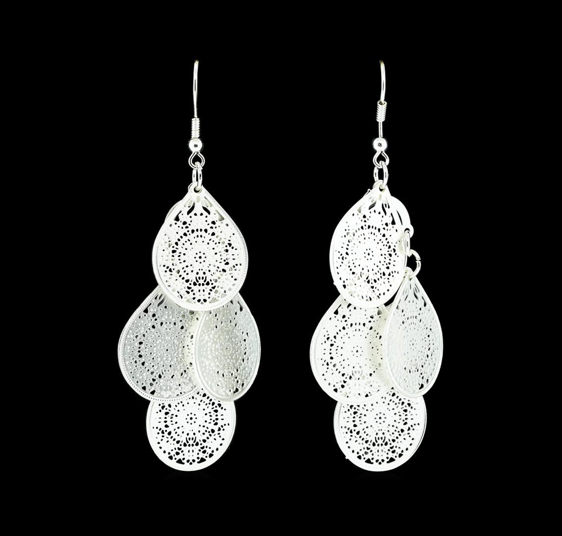 High end designer jewelry. Multi Disc Charm Earrings - Silver Plated. Silver Plated Chain. Silver. Hook. Total Weight: 7 grams.