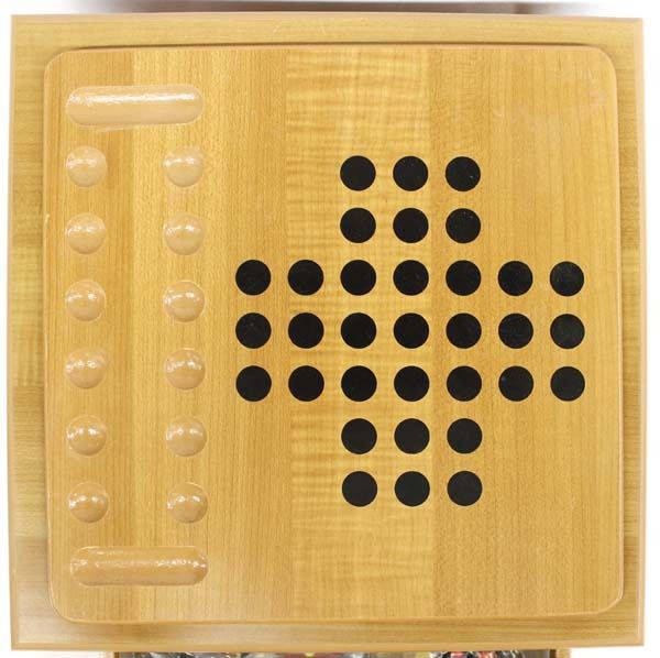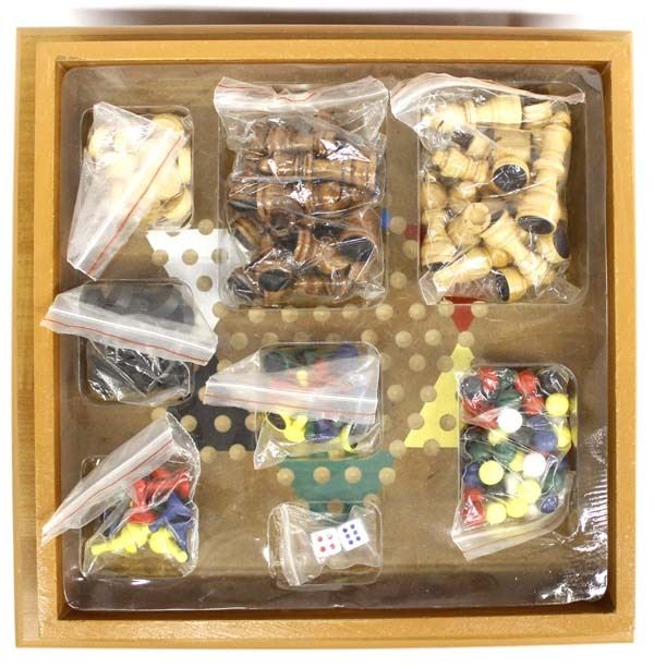 Multi-Game Board Set, 6 different game boards included in this cabinet, measures 6''H x 13'' x 13'', comes with game pawns, the top is slightly scratched