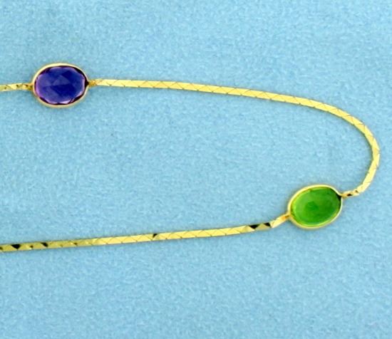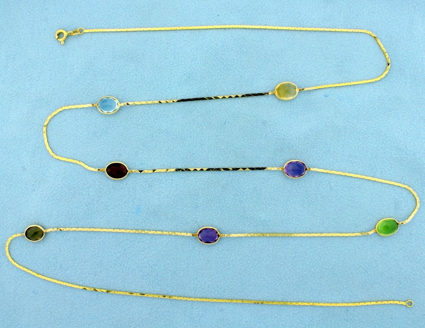 In 14k yellow gold. 33" long. Contains seven high quality natural 2.5ct gemstones including two amethyst, a citrine, a sky blue topaz, a smoky topaz, a peridot, and a garnet. 7.5g.