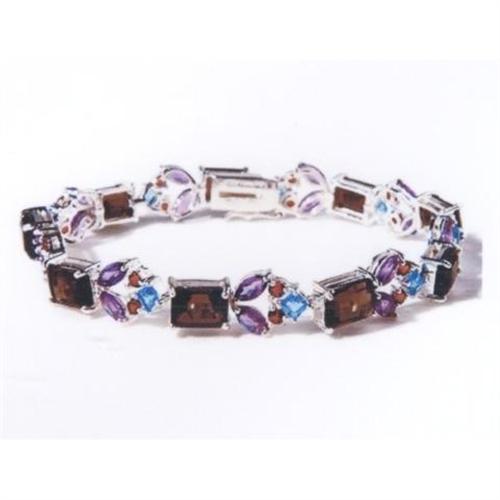 7.75 inches in length. Approx. 10 carats (carat total weight)of genuine gemstones are displayed in this significant, sterling silver bracelet. There are nine emerald cut, smokey quartz, eighteen marquise amethysts, eighteen round garnets and nine princess blue topaz. The bracelet has a safety clasp.