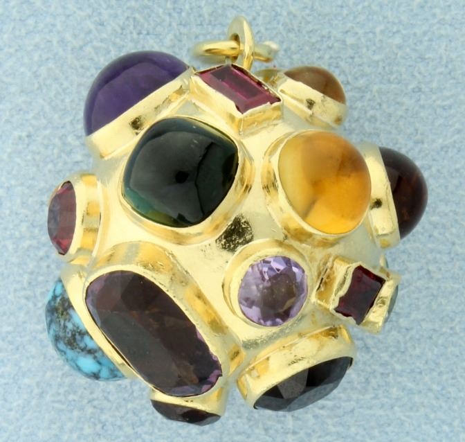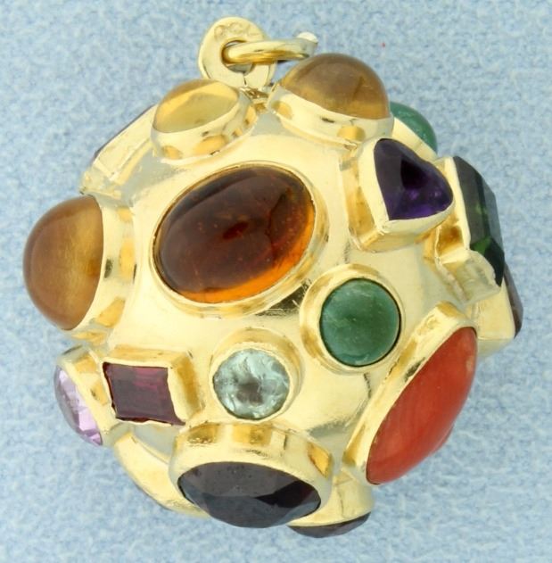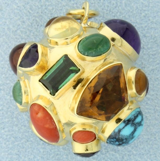 In 18K yellow gold, it is just over an inch in diameter. There are citrine, amethyst, jade, emerald, ruby, coral, turquoise, garnet, onyx & peridot gemstones of all shapes and sizes. 14.3g