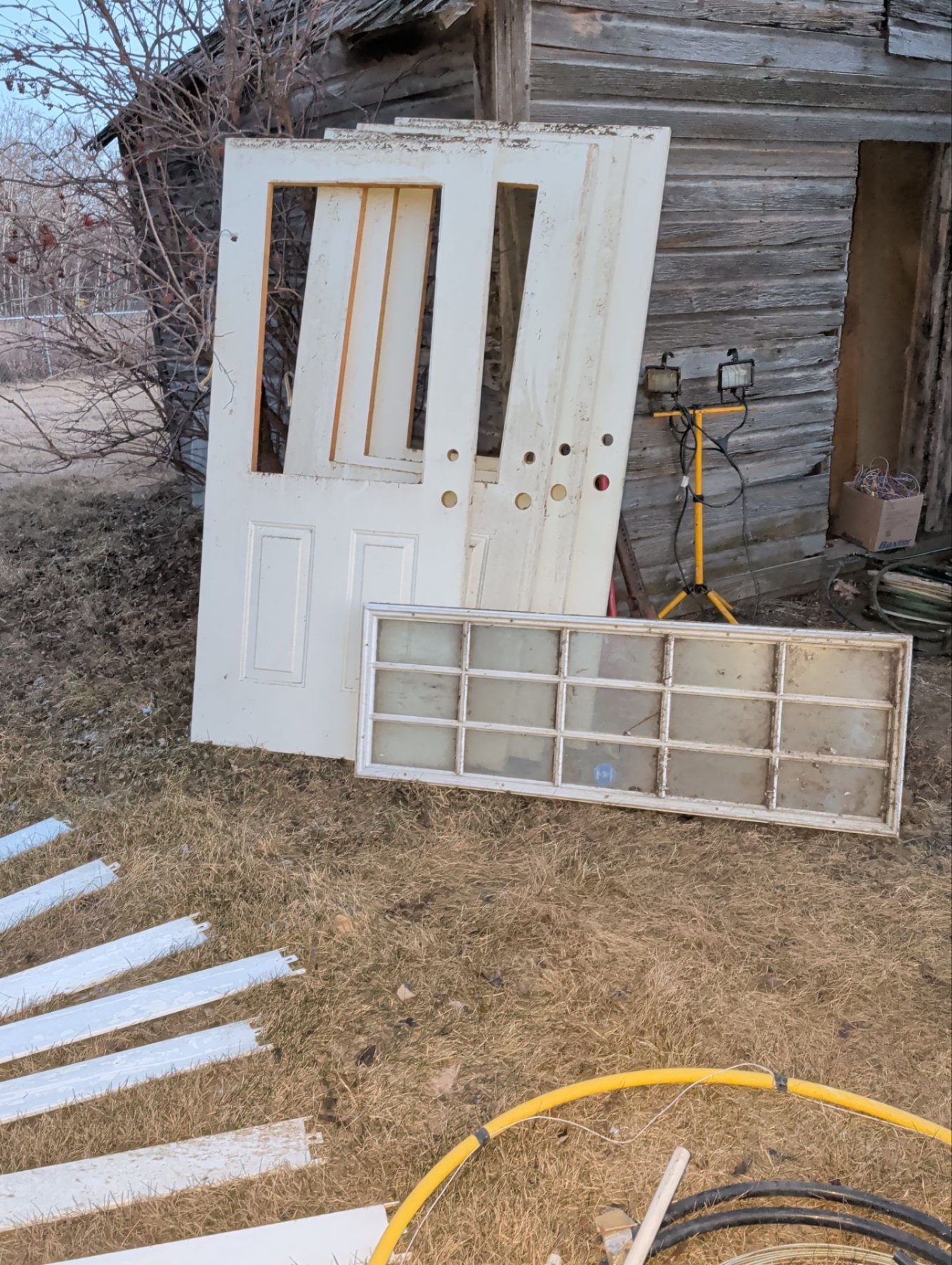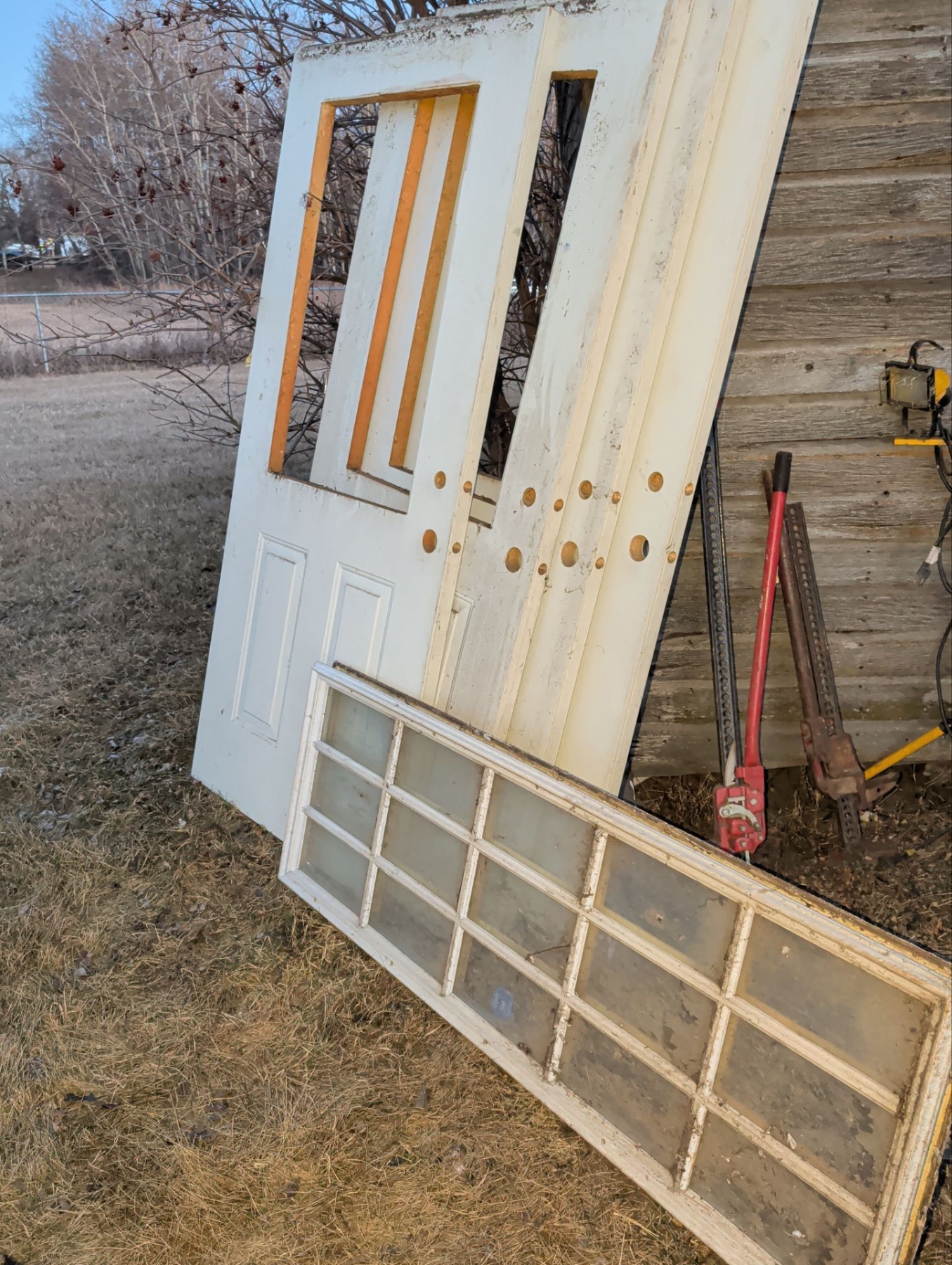 Multi Pane Wood Window Sash w/ Vintage Exterior Doors Metal Panels & Assorted Pex Pipes