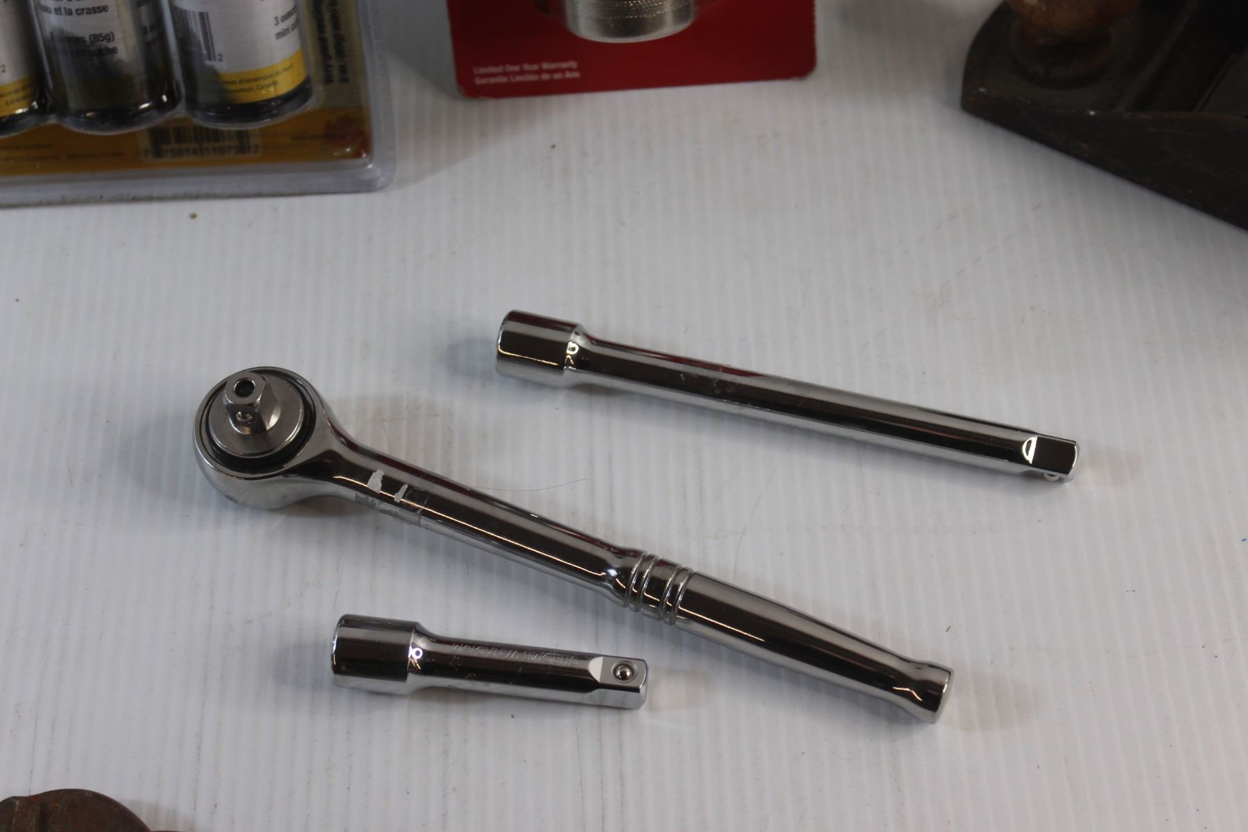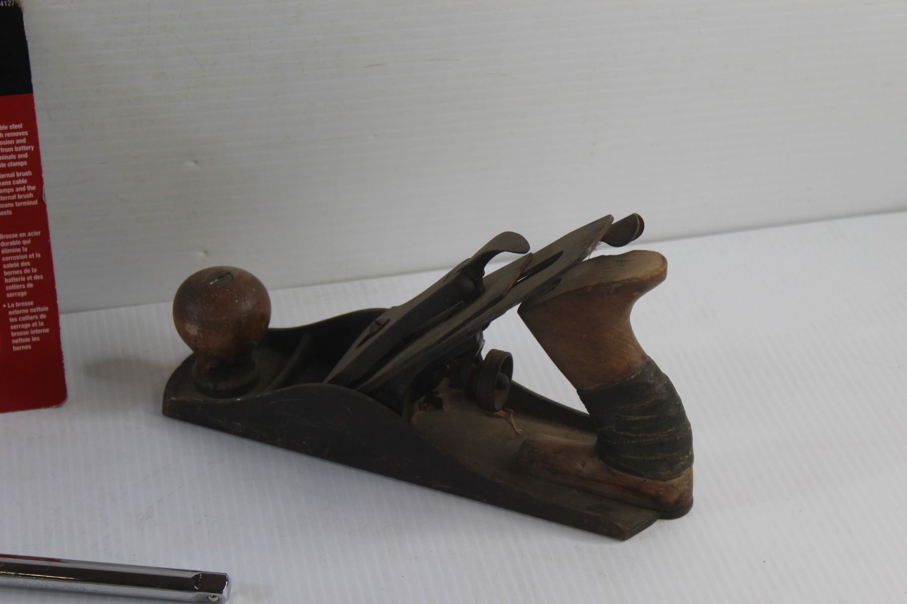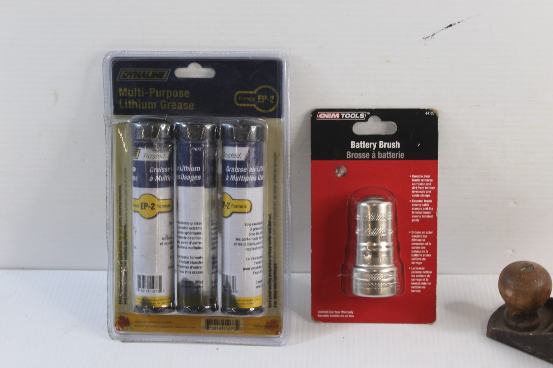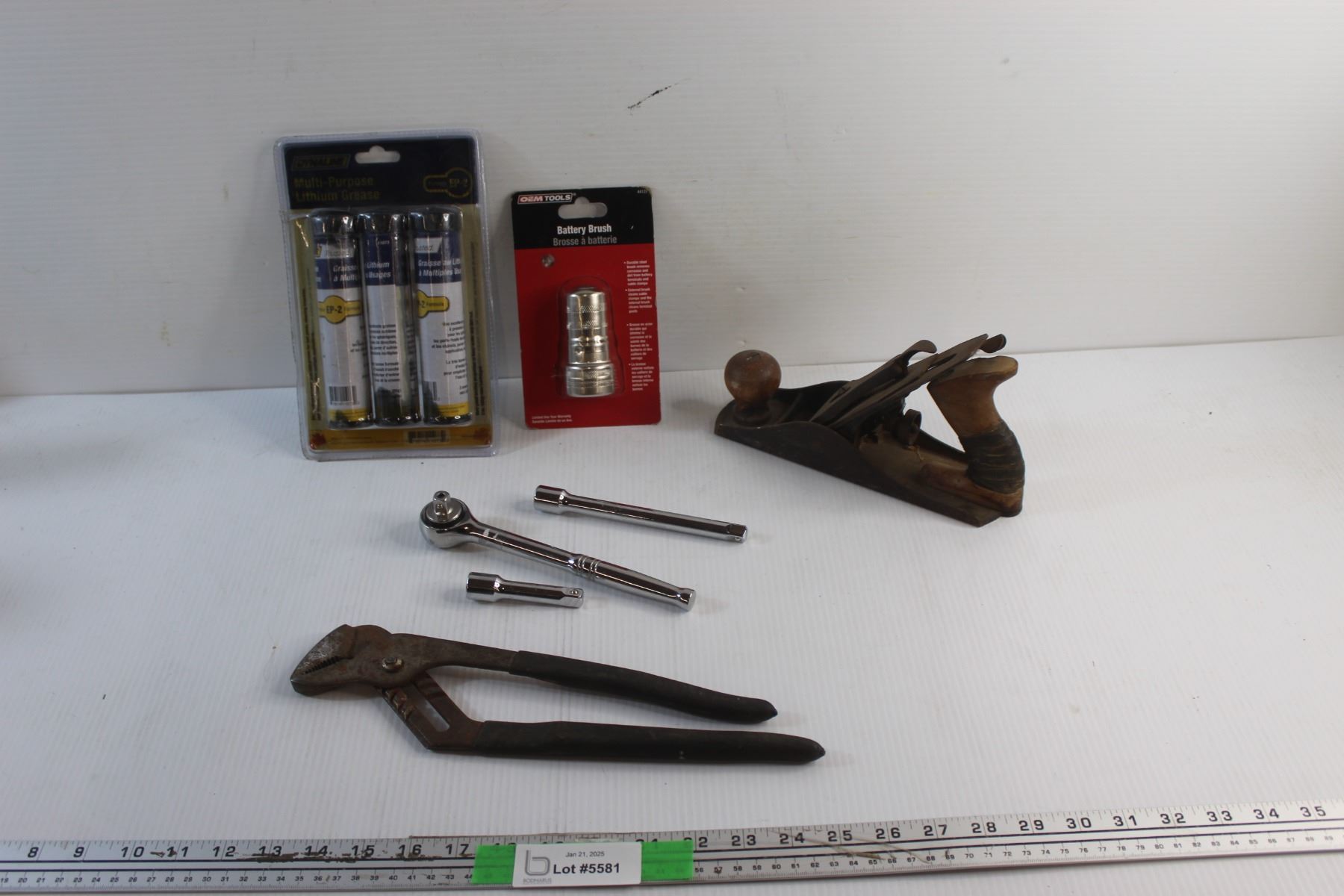 Multi Purpose Lithium Grease, Battery Brush, Pipe Wrench, Wood Plane and Wrench
